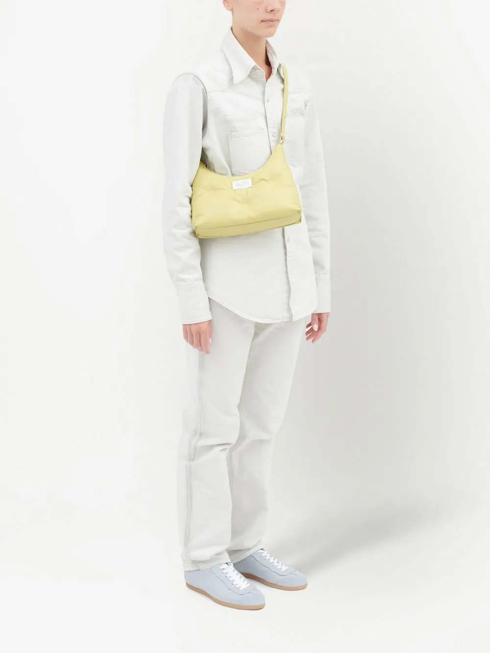 Jaune pastel, peau d’agneau, design matelassé, fermeture zippée sur le dessus, logo brodé signature, patch logo sur le devant, bride porté épaule en cuir et maillons de chaîne, compartiment principal, poche interne zippée.