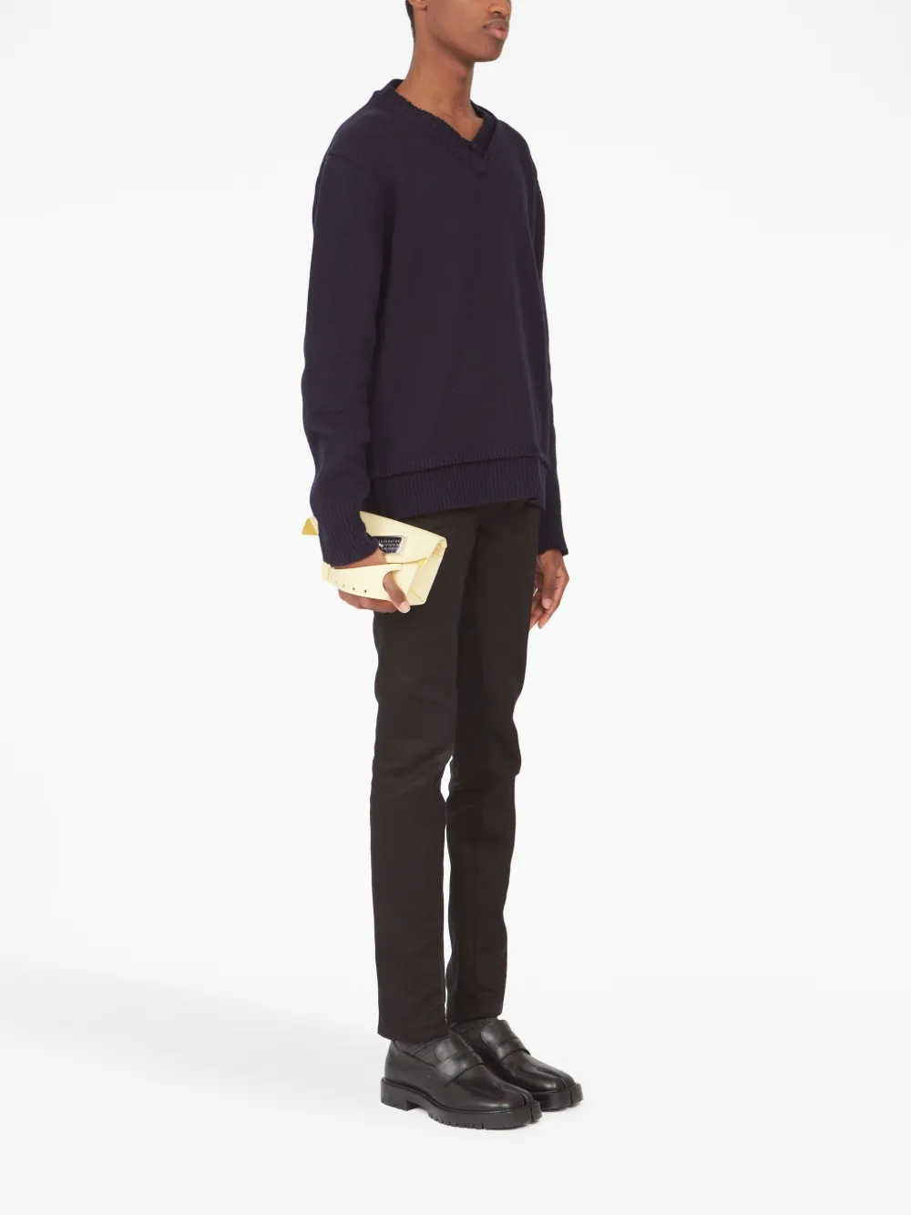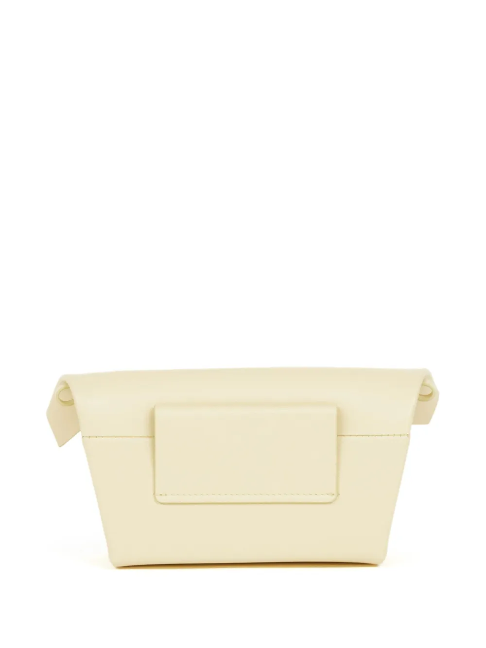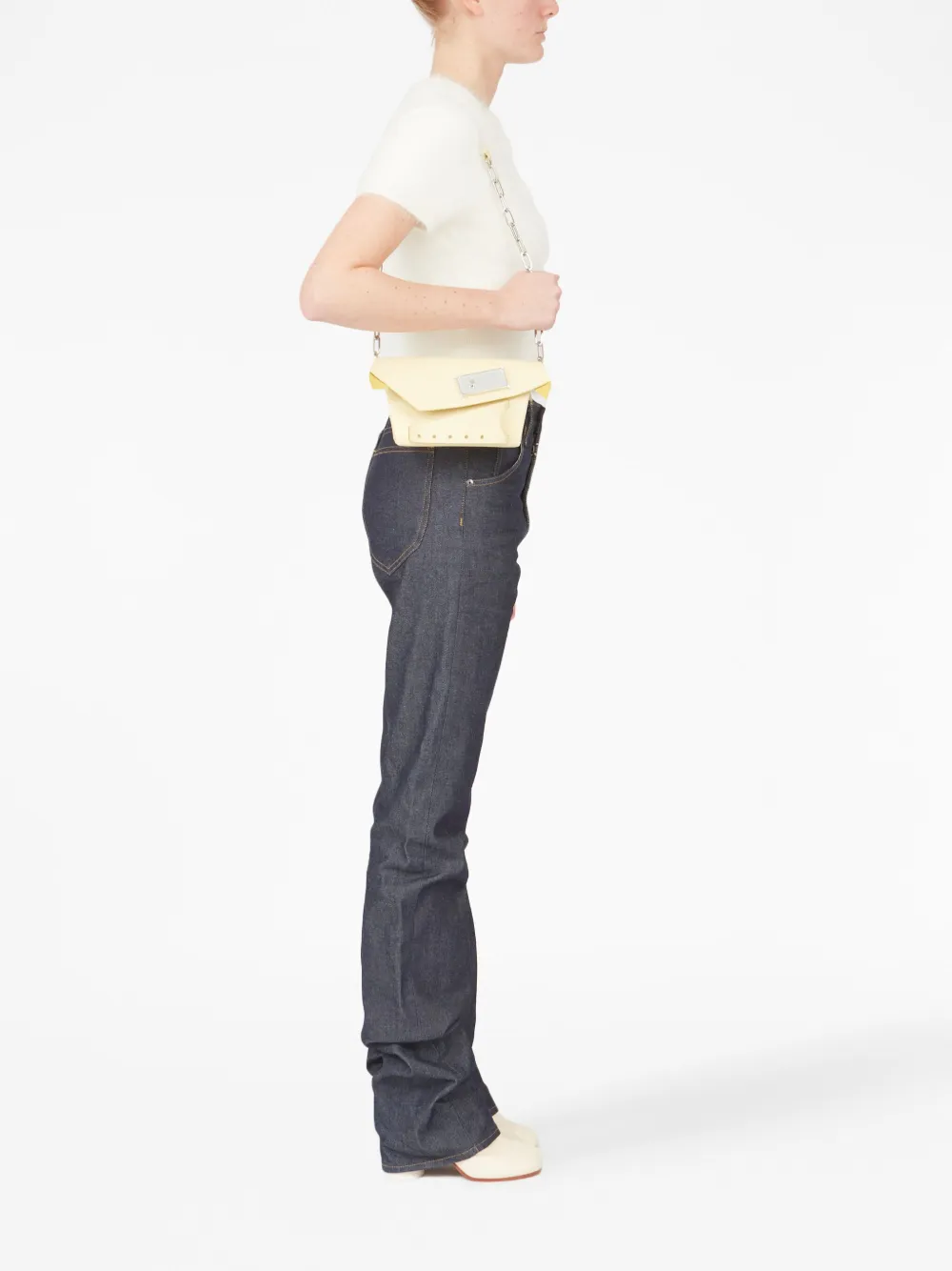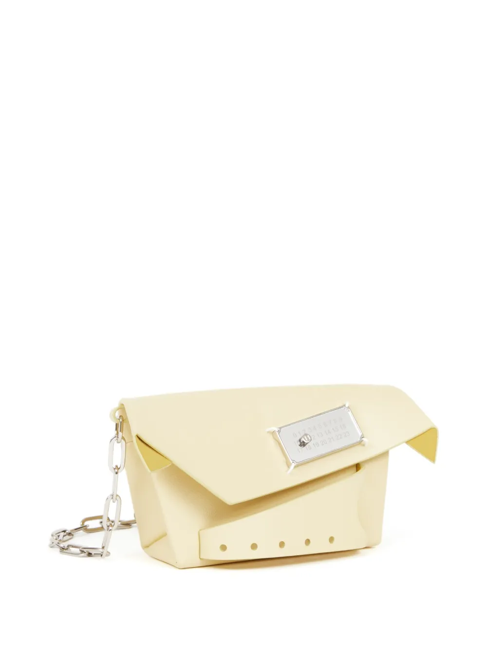 Jaune citron, cuir de veau, design asymétrique, logo numéroté signature, finitions en métal argenté, bride porté épaule en chaîne détachable, rabat sur le dessus, poche intérieure plaquée, trous percés, compartiment principal.