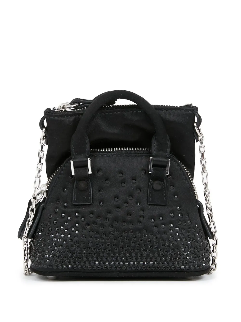 Noir, ornements en cristal Swarovski , appliqué chiffre sur le devant, deux anses arrondies, bride porté épaule en chaîne détachable, fermeture zippée sur le dessus, compartiment principal, design peint à la main, pieds en métal, logo imprimé à l’intérieur, finitions en métal argenté.