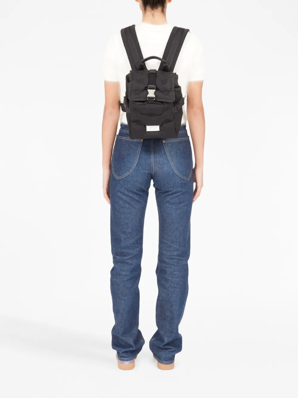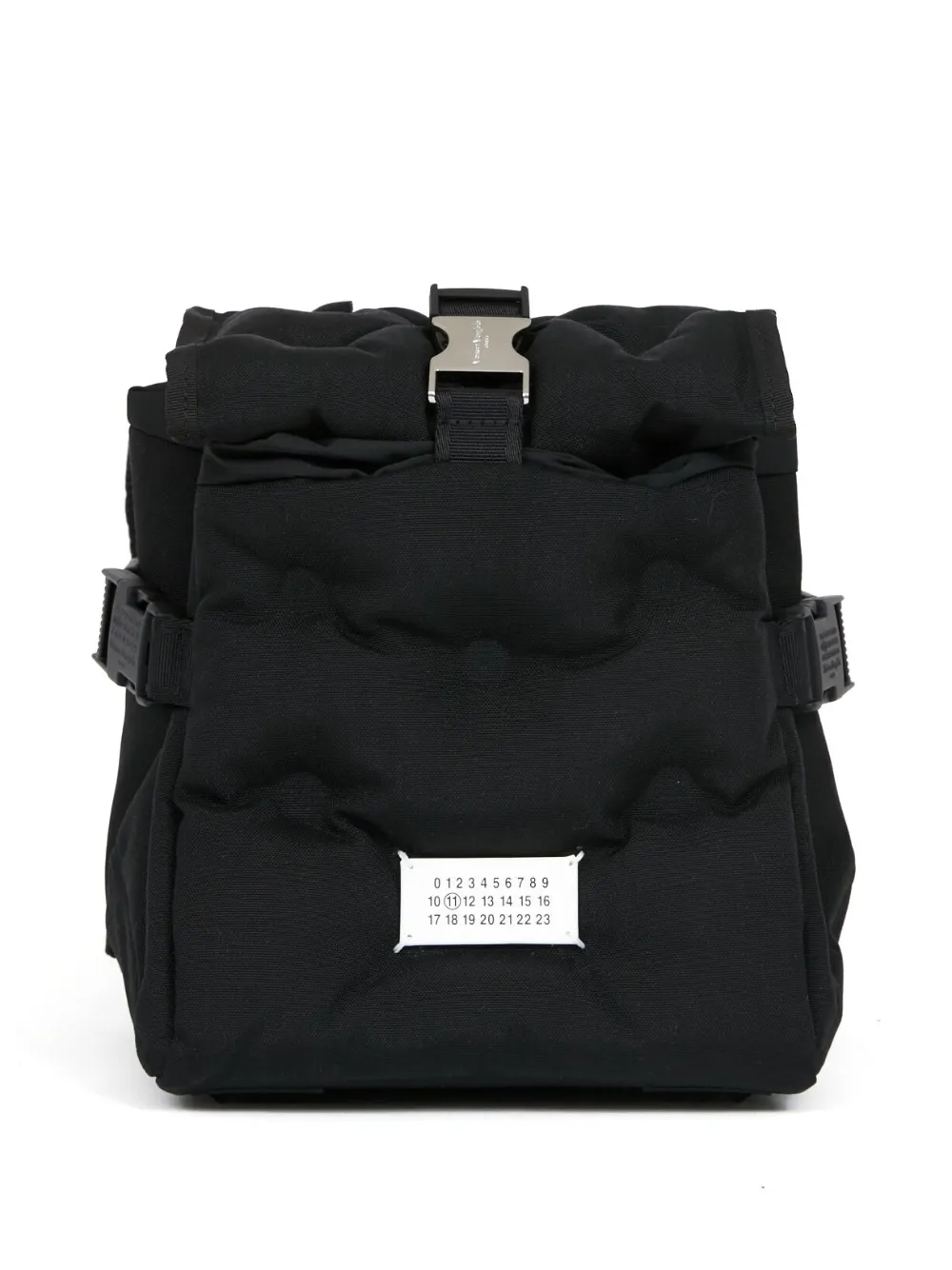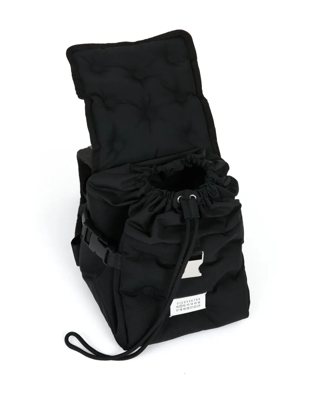 Noir, cuir de veau, design matelassé, logo numéroté signature, patch logo sur le devant, anse classique, brides porté épaule ajustables, fermeture à boucles sur le dessus, compartiment principal.
