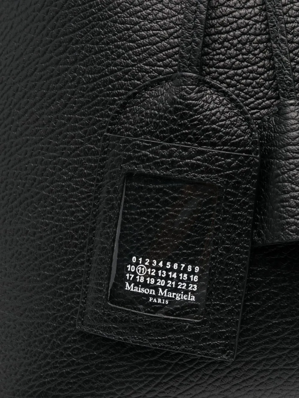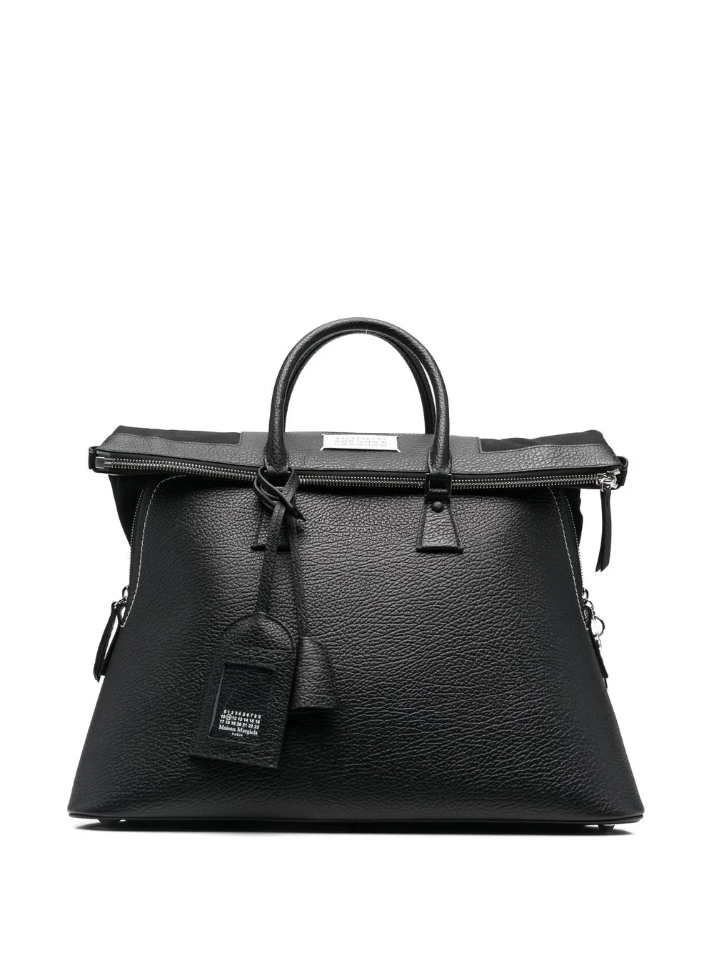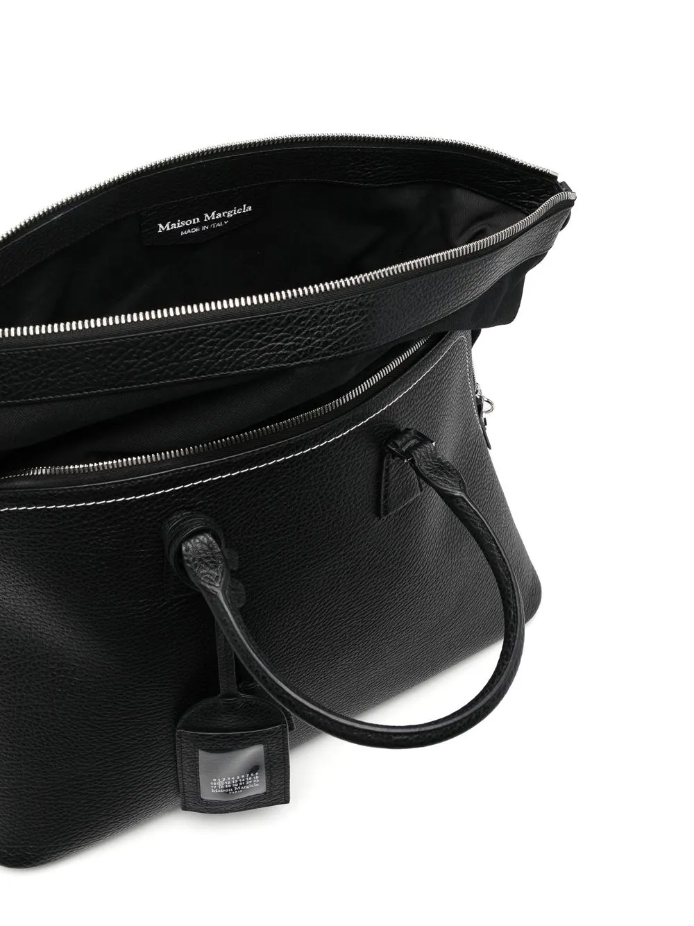 Noir, cuir, texture grainée, étiquette en cuir, fermeture zippée à double sens, anses arrondies, fermeture zippée sur le dessus, pieds en métal.