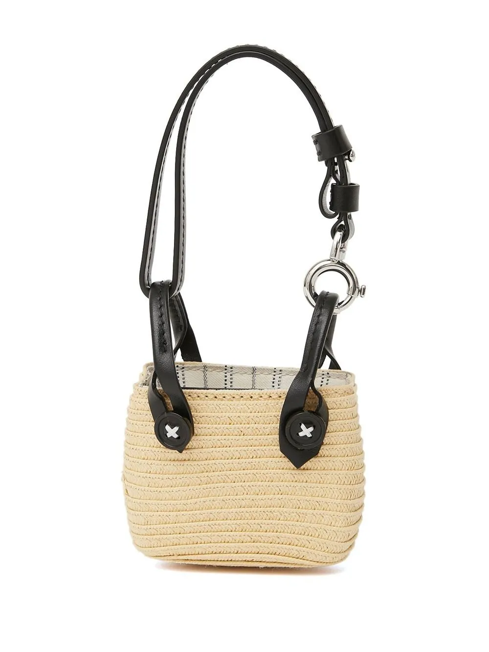 Beige, noir, raphia, patch logo sur le devant, ouverture sur le dessus, deux anses arrondies, compartiment principal.
