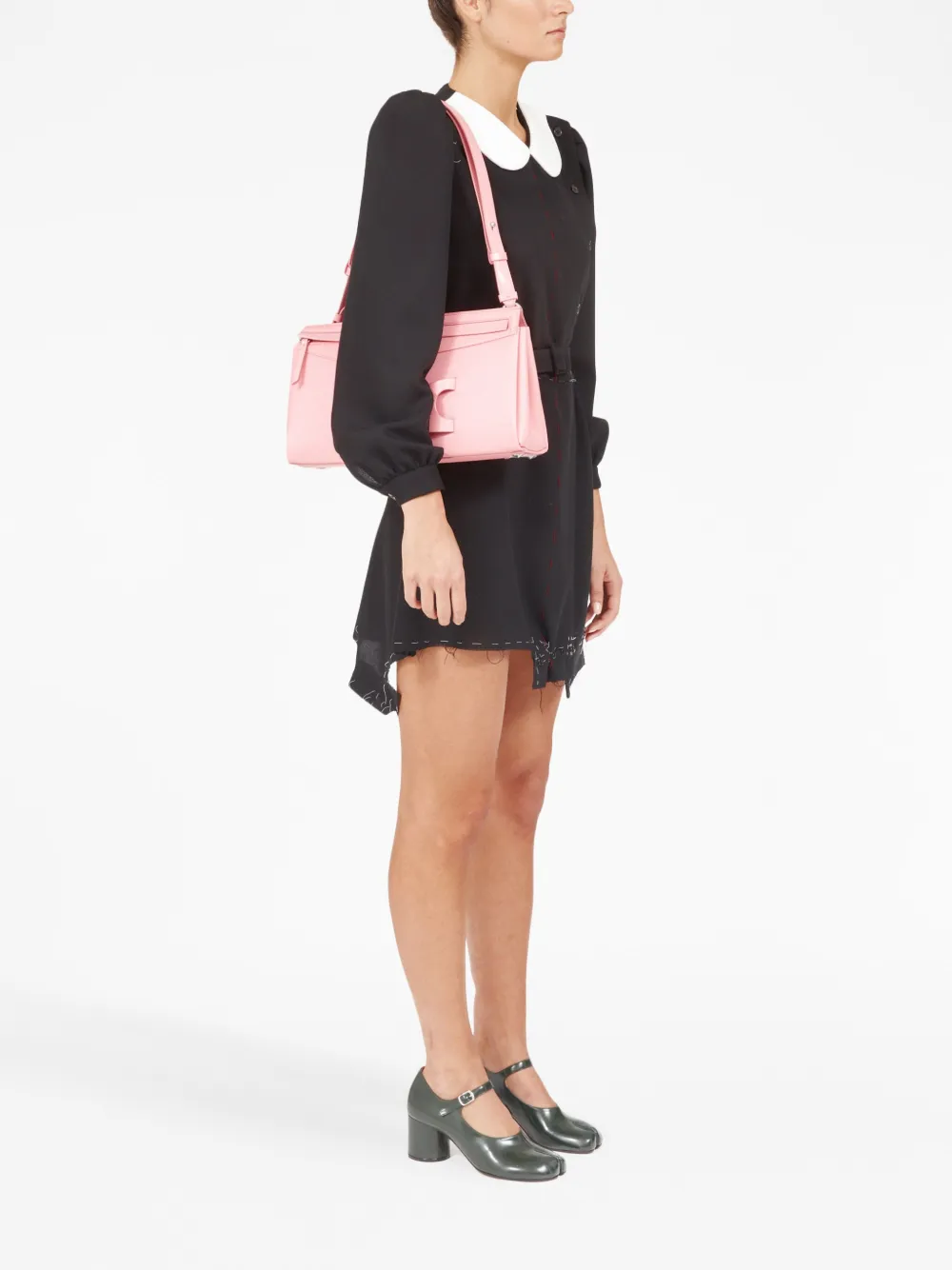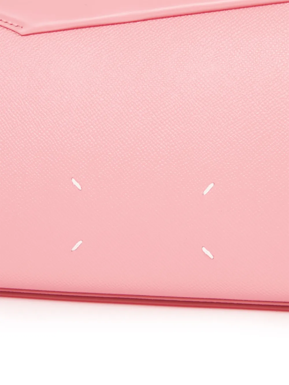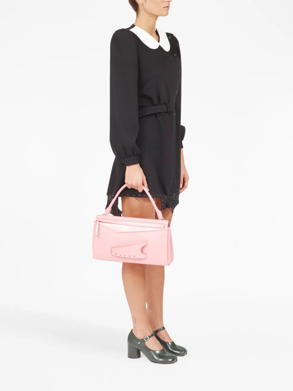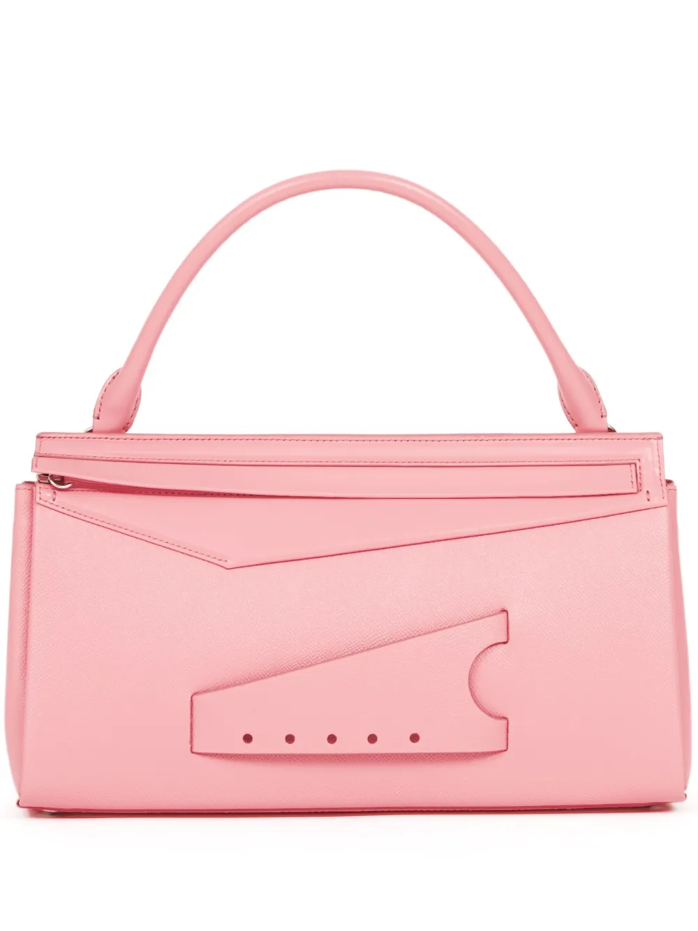 Rose poudré, peau de mouton, finitions en métal argenté, coutures ton sur ton, logo brodé signature, trous percés, anse classique, fermeture zippée dissimulée, compartiment principal.