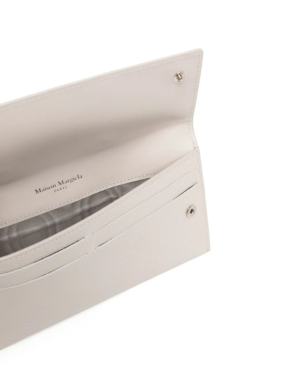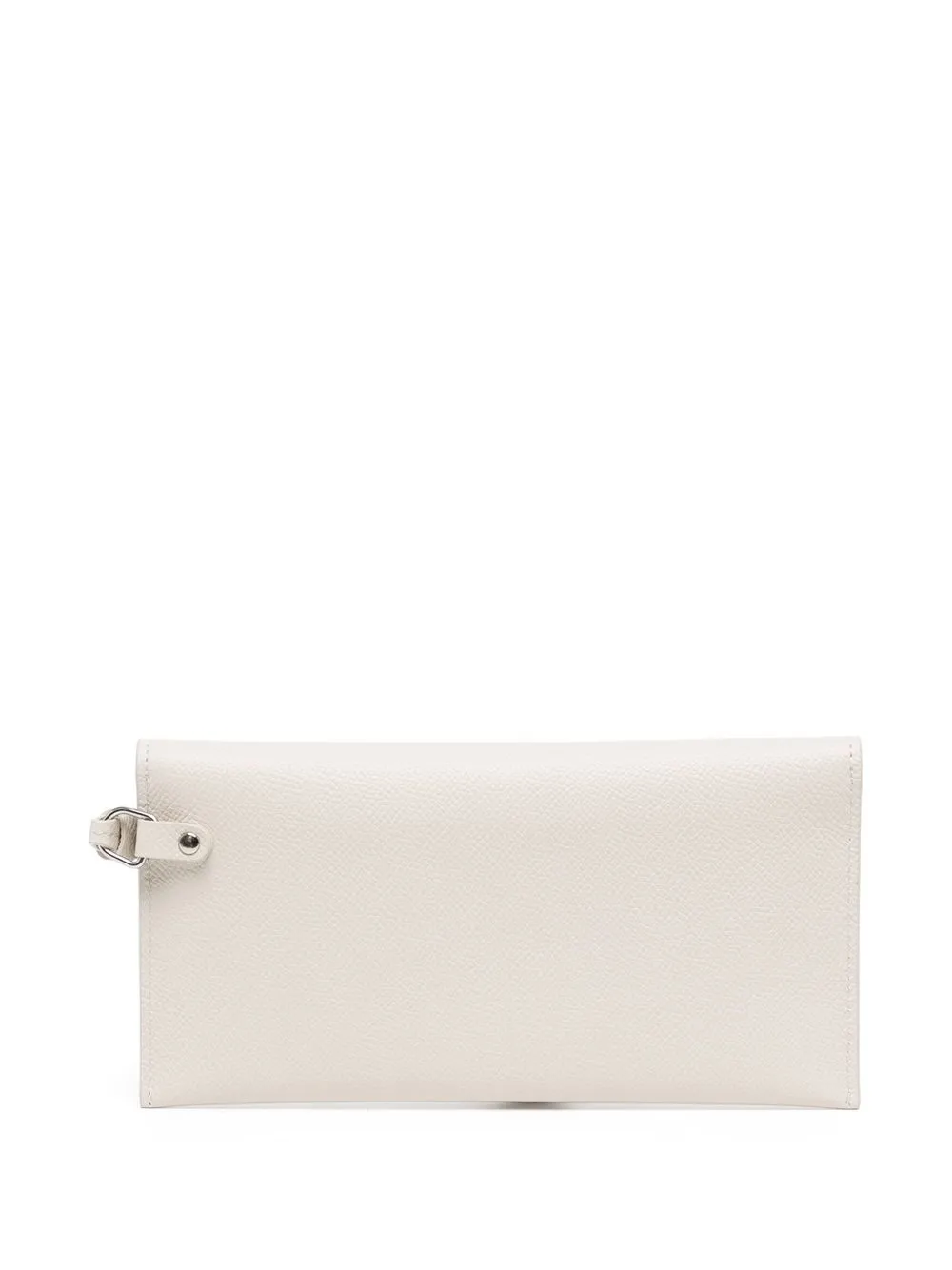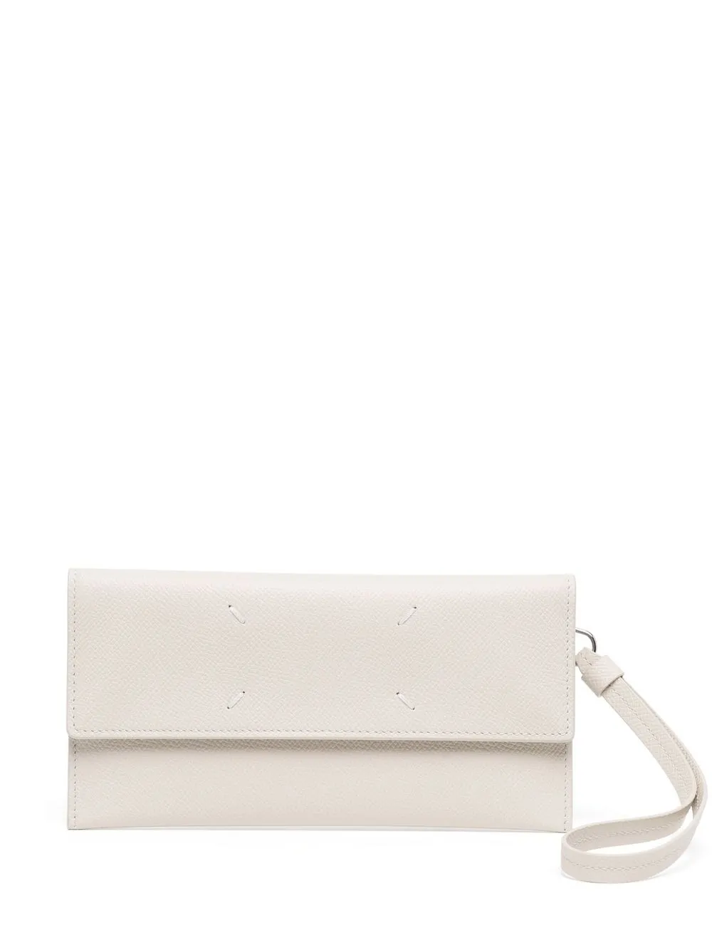 Blanc, cuir de veau, texture grainée, couture décorative, rabat sur le devant, compartiment principal.