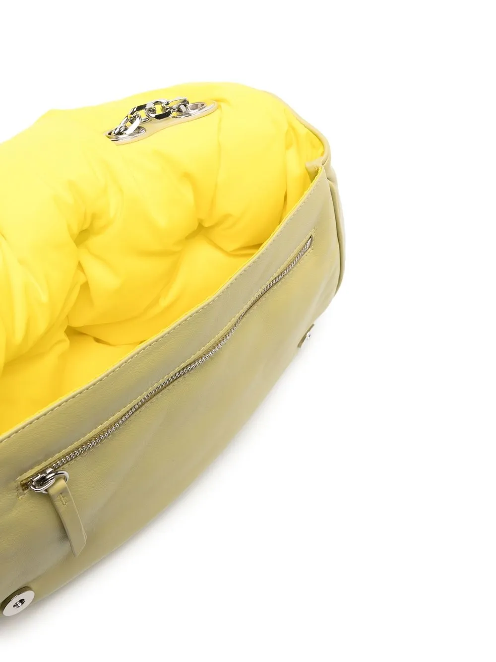 Vert clair, cuir de veau, patch logo sur le devant, effet matelassé, bride portée épaule en chaine détachable, rabat sur le dessus à fermeture magnétique, compartiment principal, poches intérieures zippées.