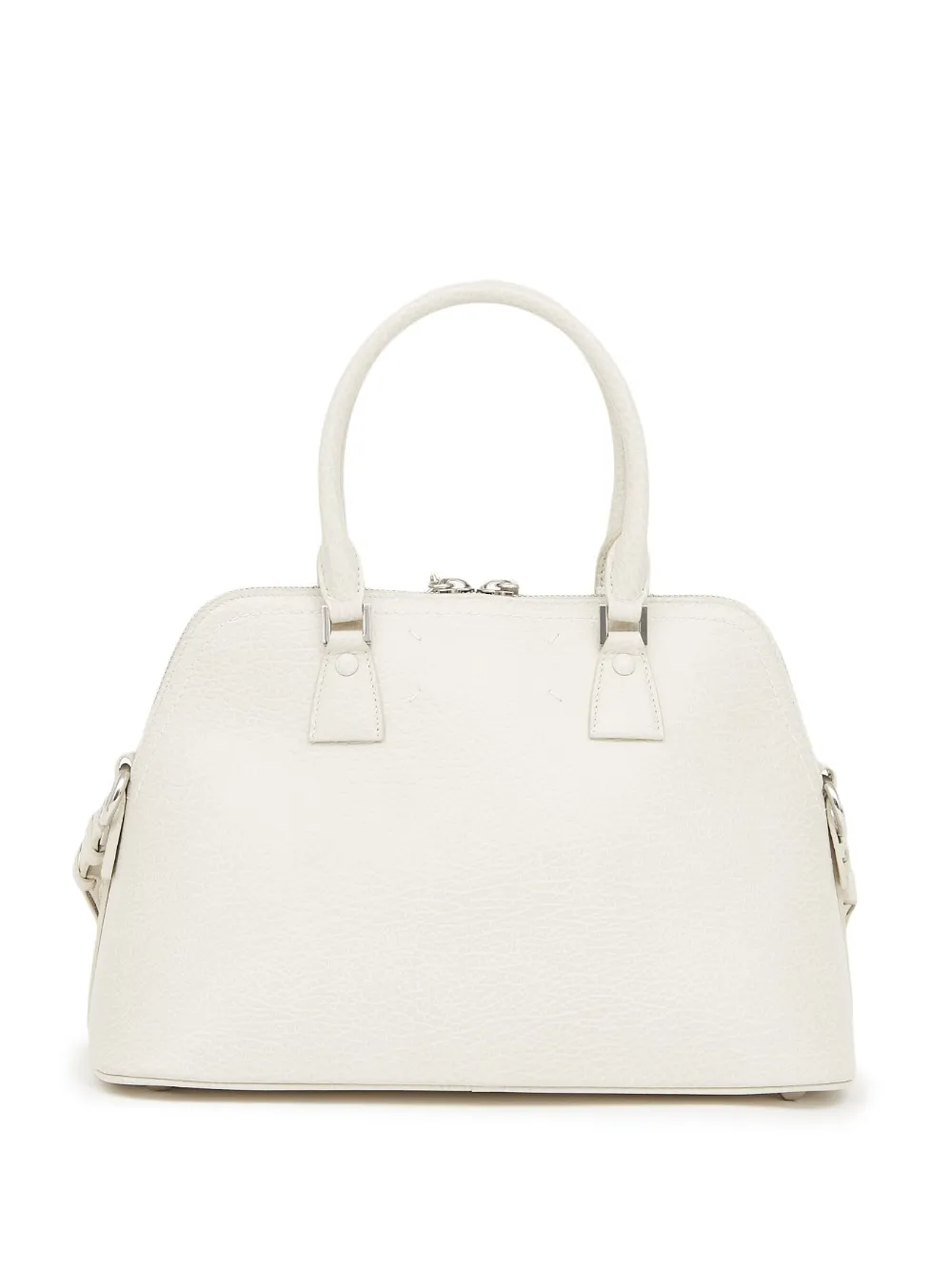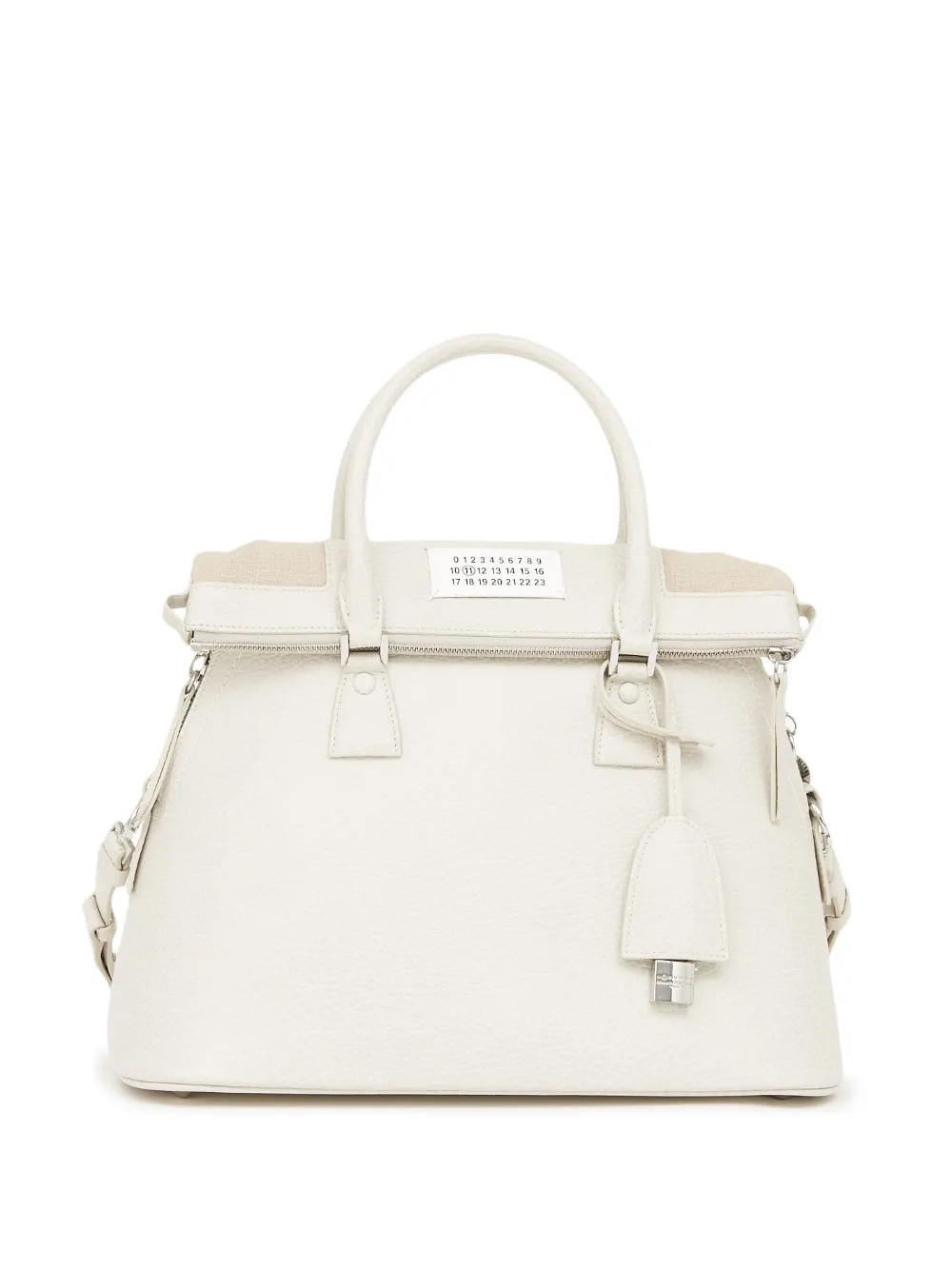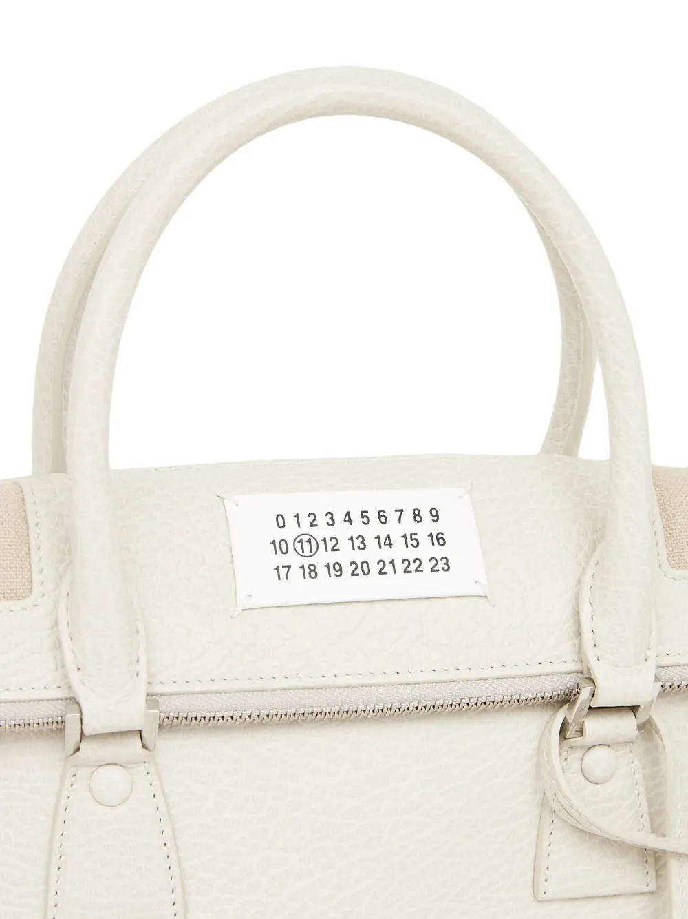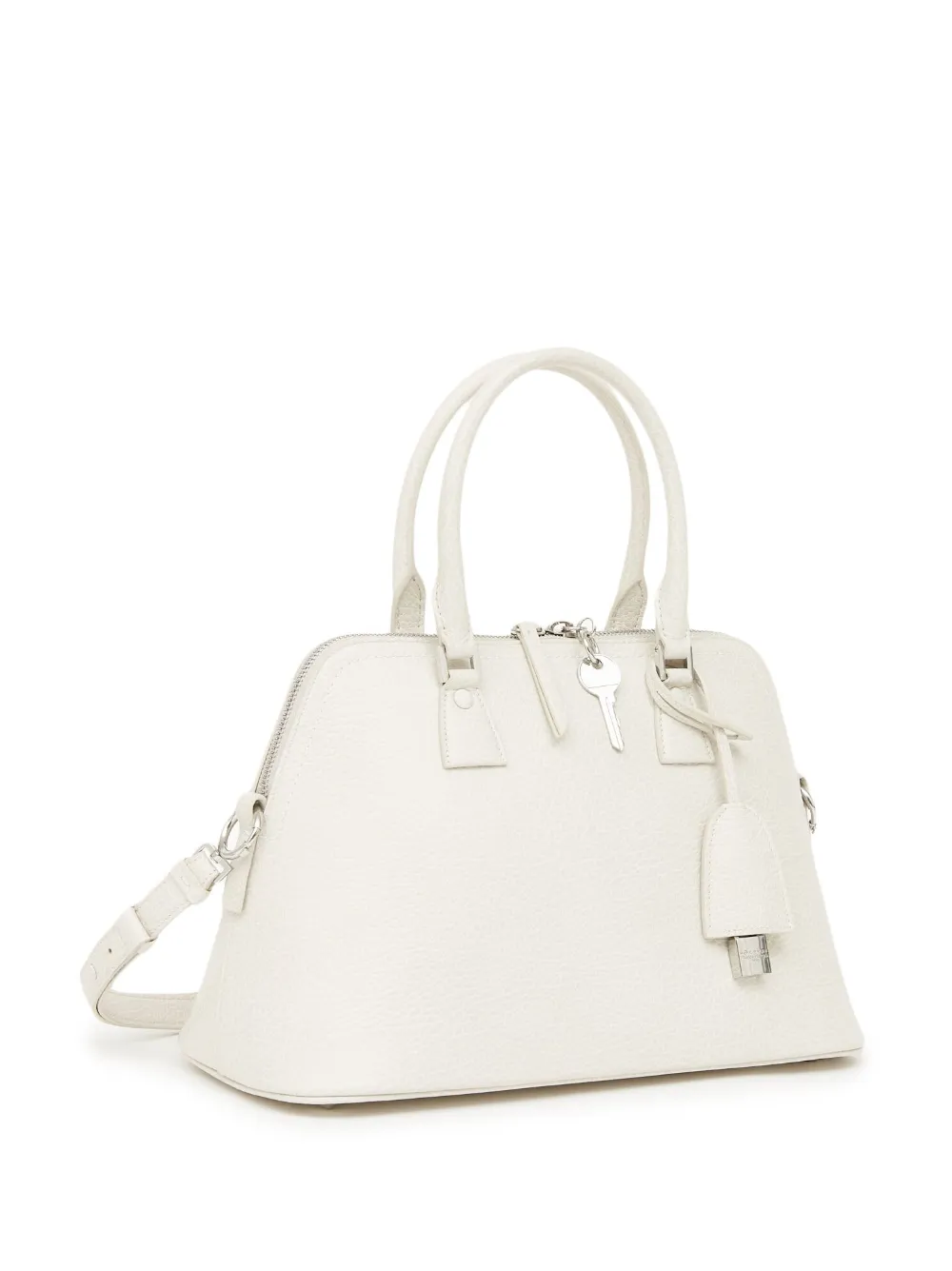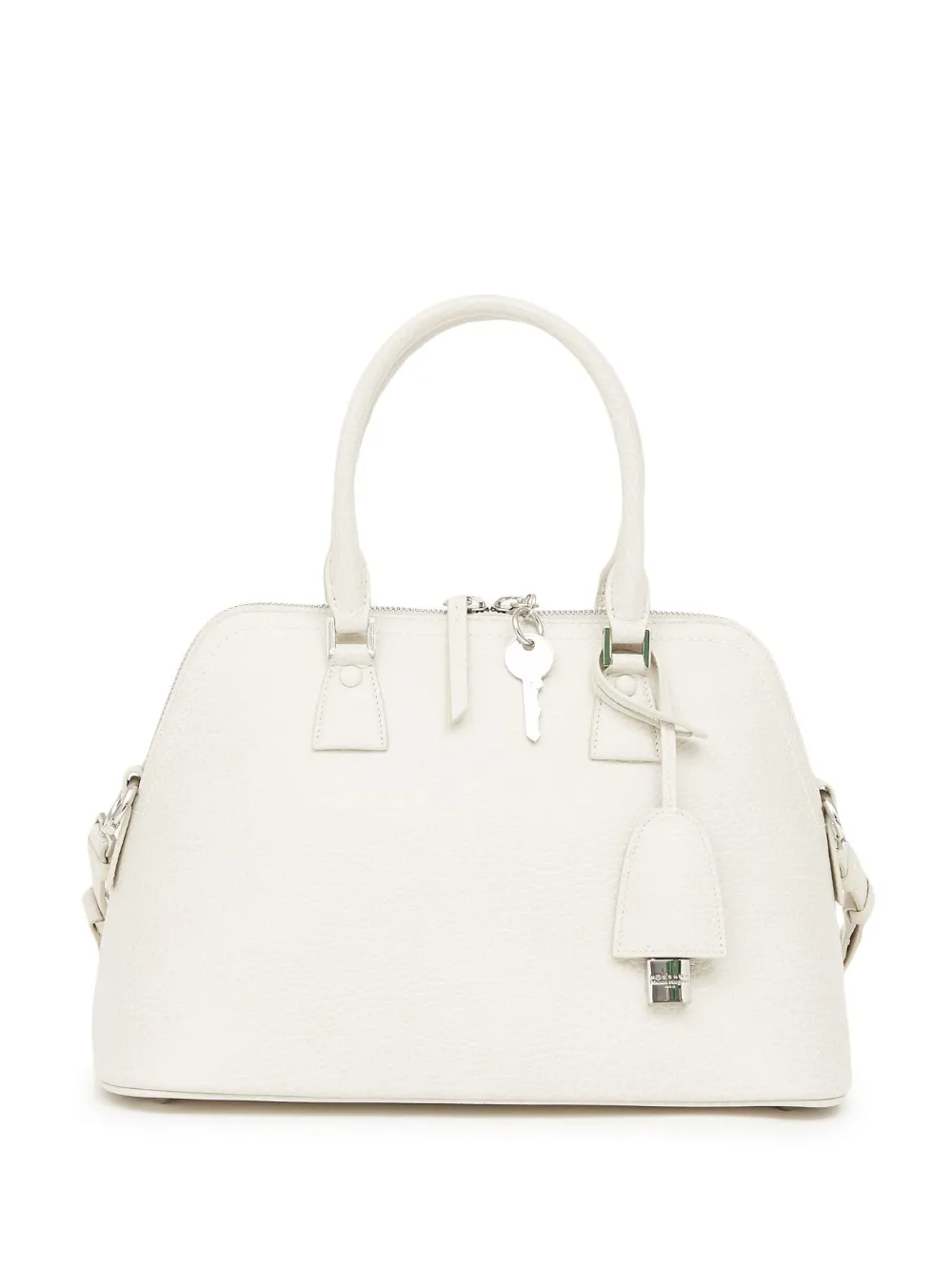 Blanc, logo numéroté signature, breloque à design de clé, rabat sur le dessus, fermeture zippée sur le dessus, bride porté épaule détachable et ajustable, anses sur le dessus, compartiment principal, pieds en métal.