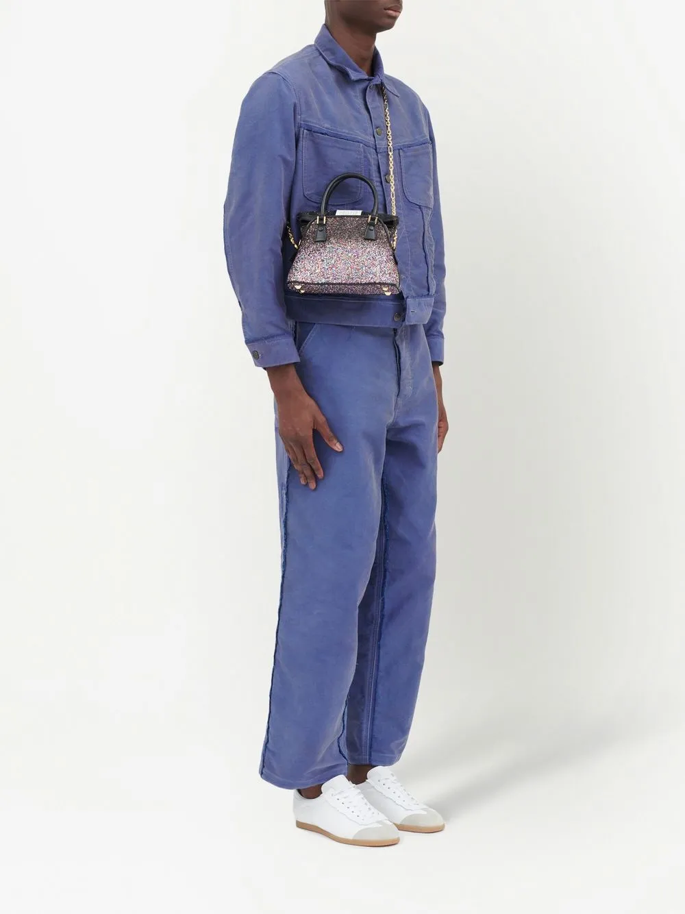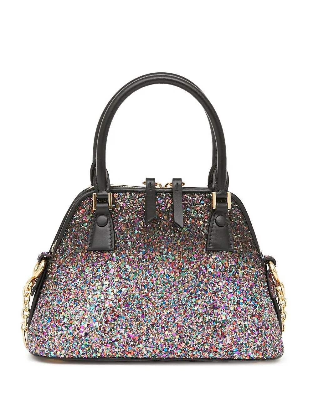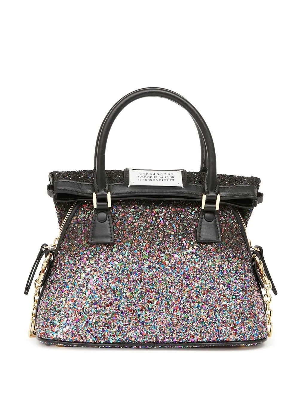 Noir/multicolore, cuir de veau, détail pailleté, forme trapèze, appliqué chiffre sur le devant, anses sur le dessus.