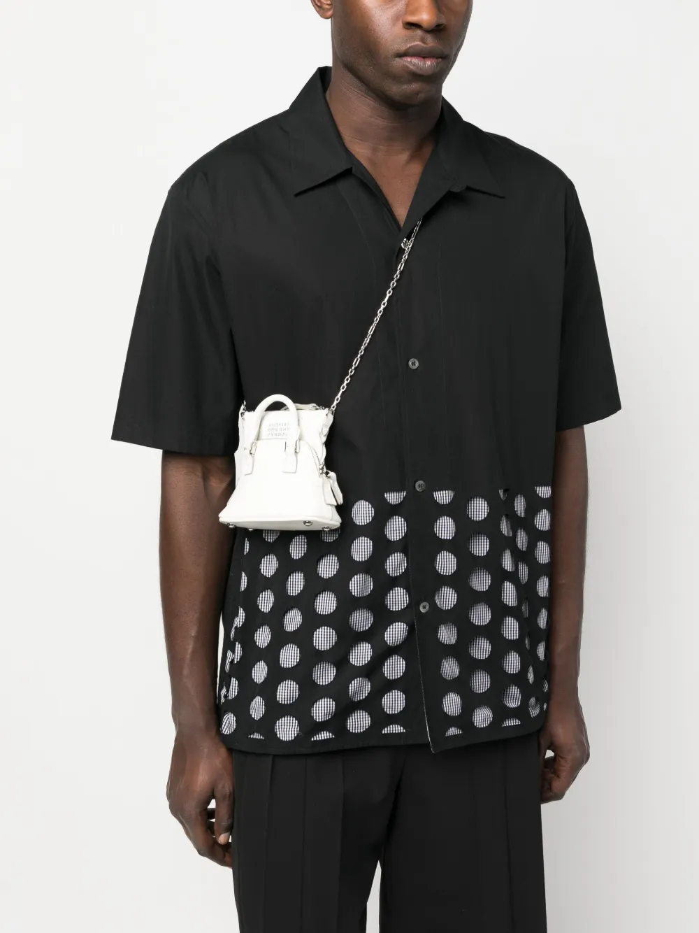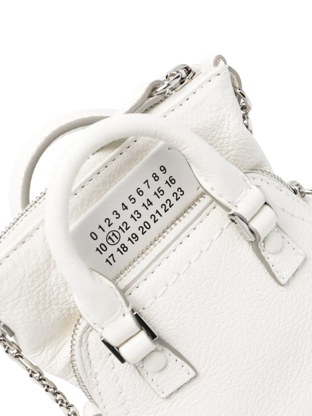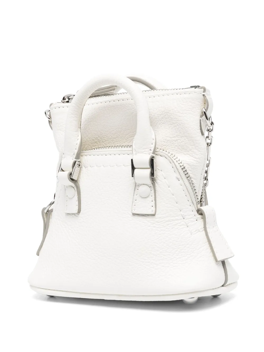 Blanc Cloud, cuir de veau, finitions en métal argenté, texture grainée, plaque slogan, anses sur le dessus, bride porté épaule en chaîne, fermeture zippée sur le dessus, poche zippée sur le devant, compartiment principal.