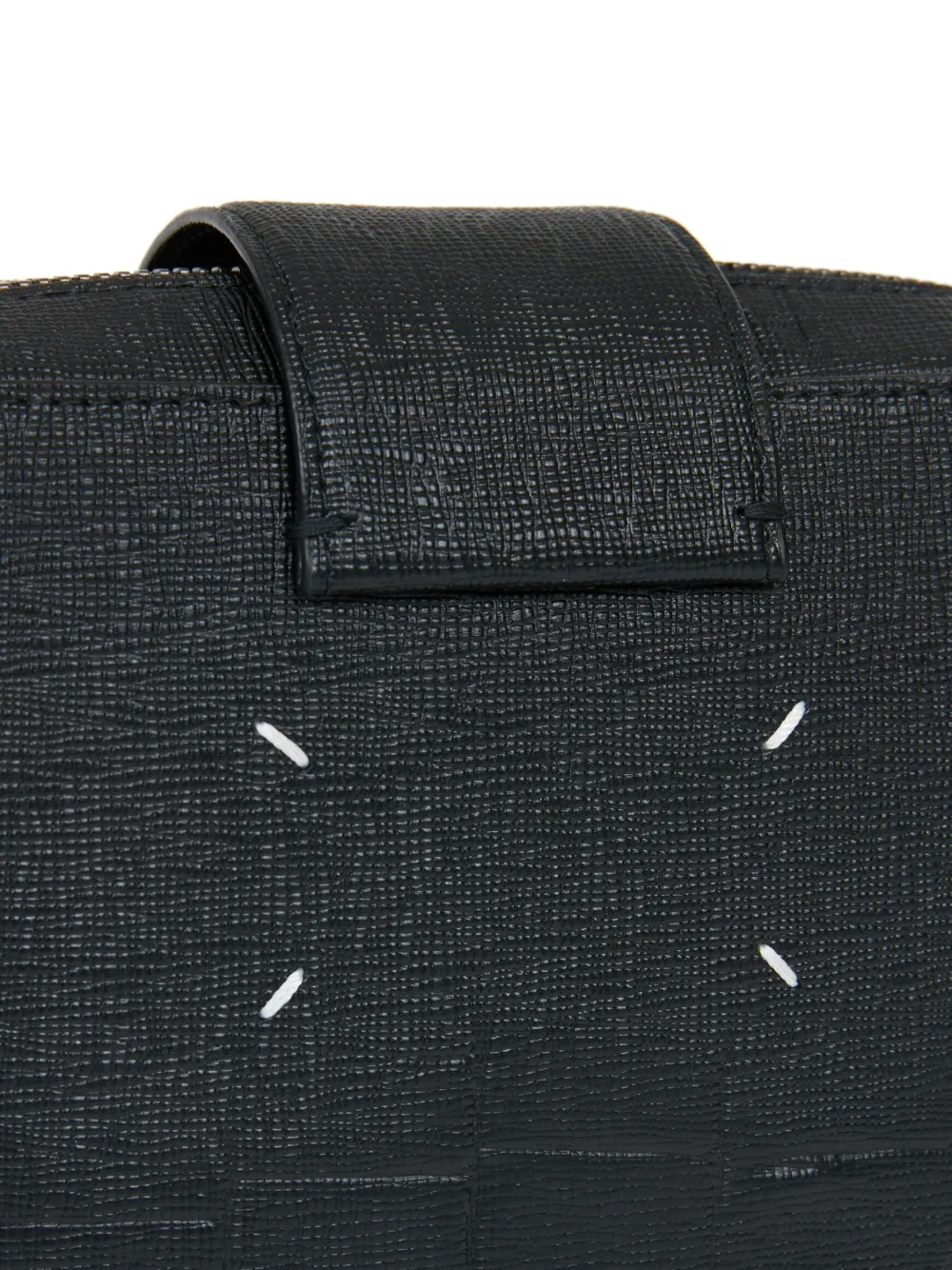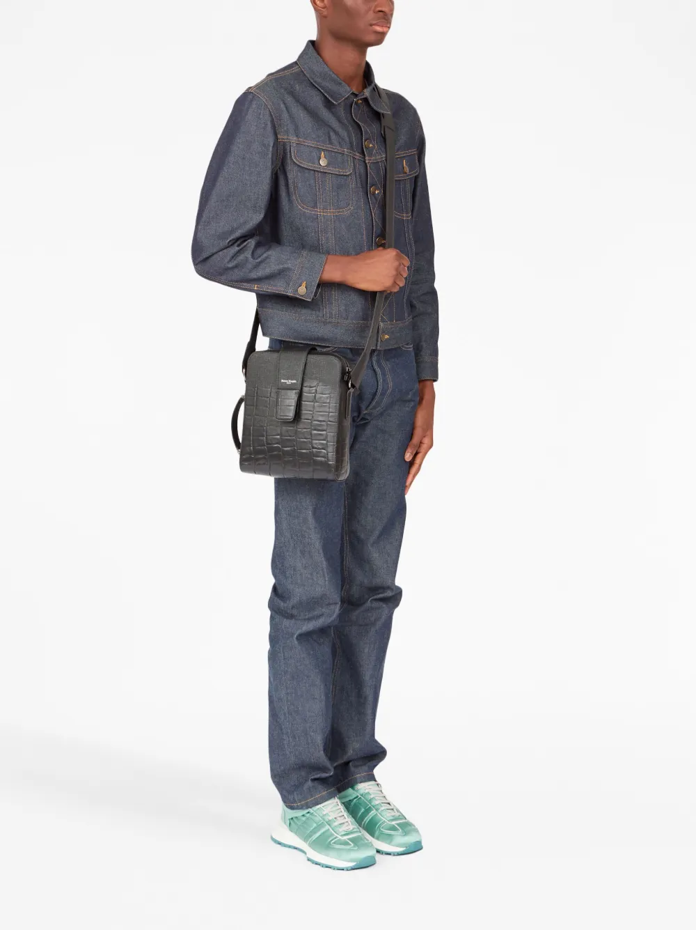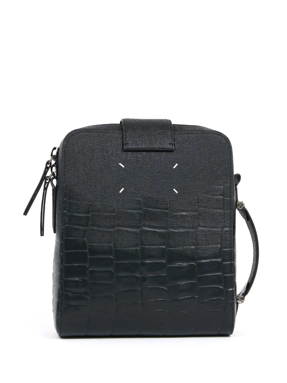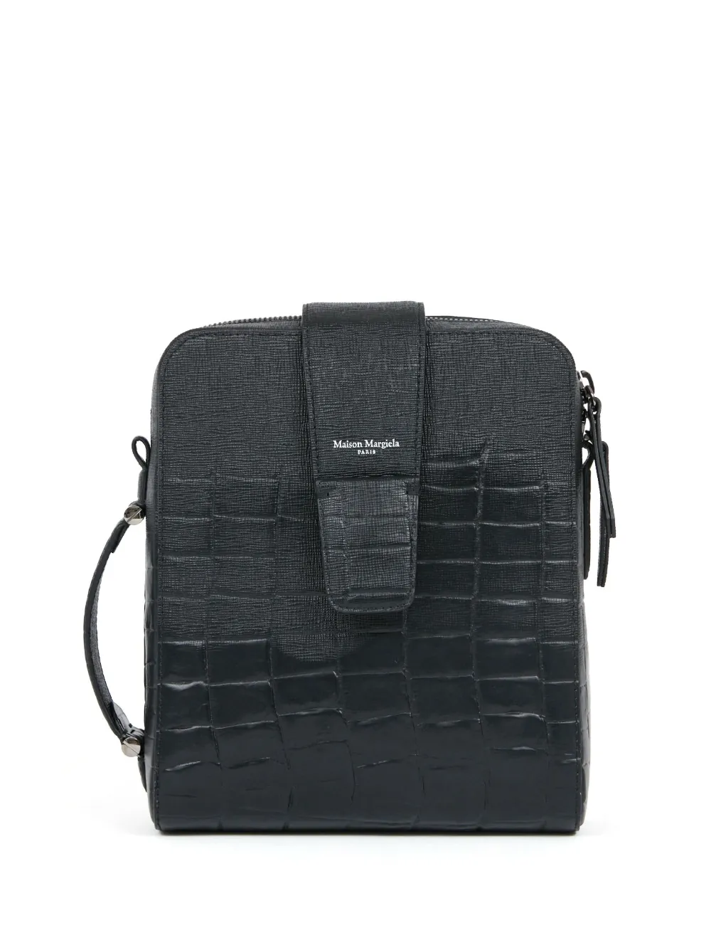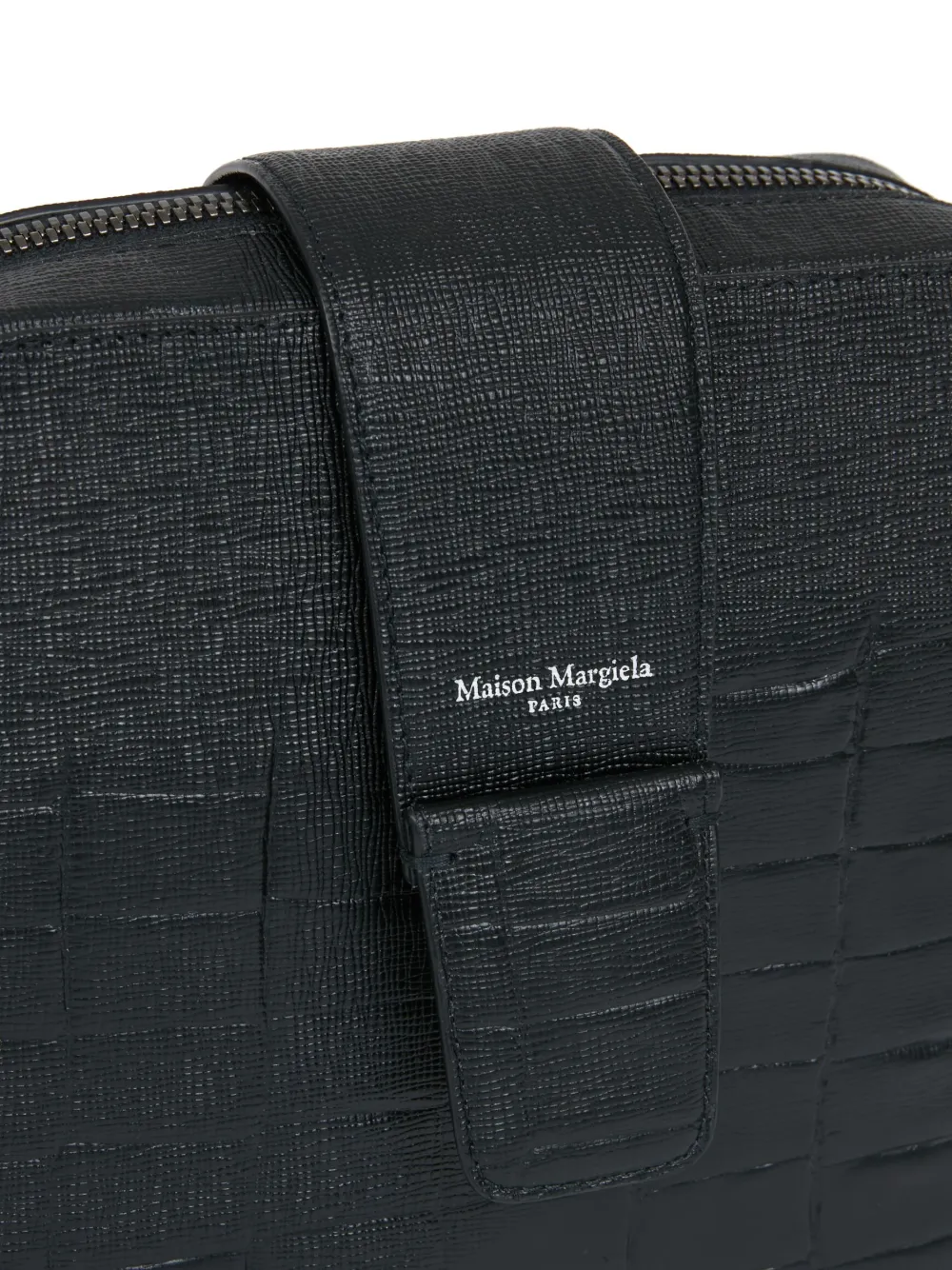 Noir, effet peau de crocodile, fermeture zippée sur le dessus, bride porté épaule détachable, compartiment principal.