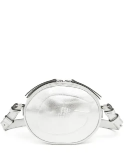Argenté, cuir, grain lisse, fini métallisé, logo embossé sur le devant, forme ovale, fermeture zippée tout autour, bride porté épaule ajustable, compartiment principal.
