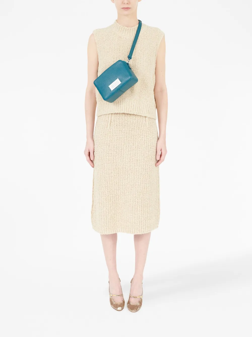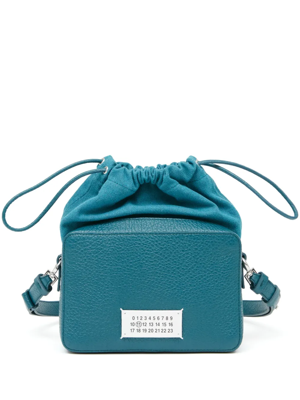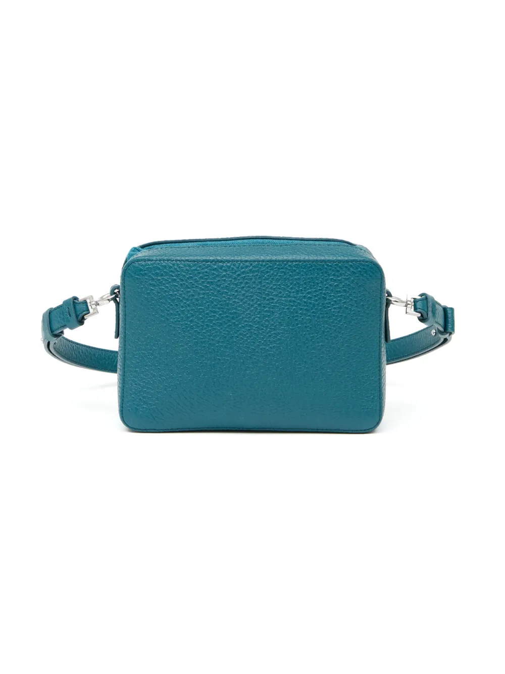 Bleu océan, cuir, texture grainée, patch logo sur le devant, fermeture zippée sur le dessus, bride porté épaule détachable et ajustable, pochette détachable, compartiment principal.