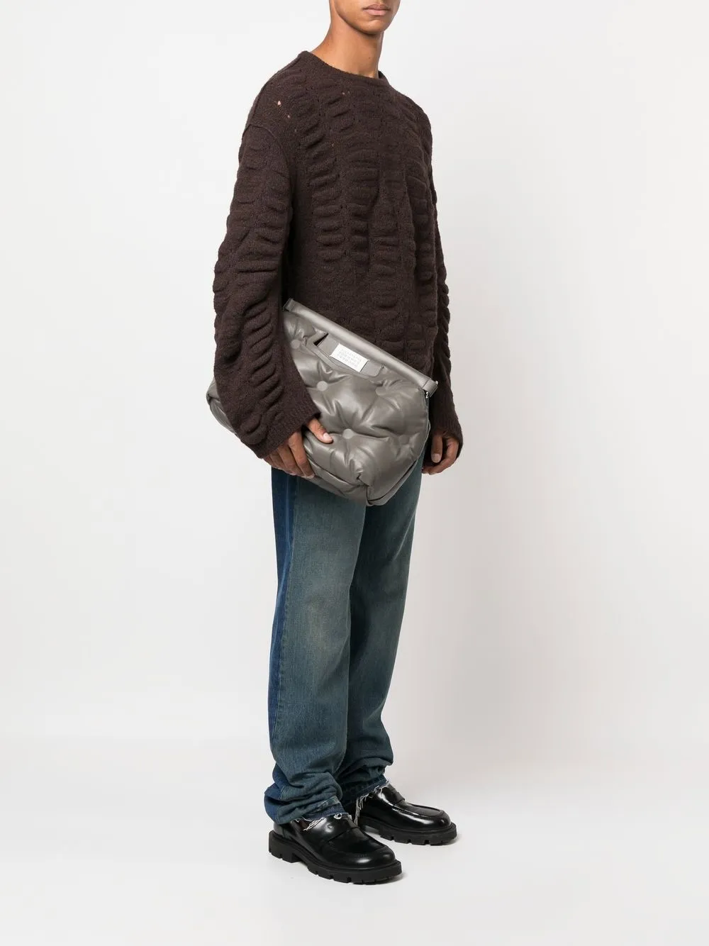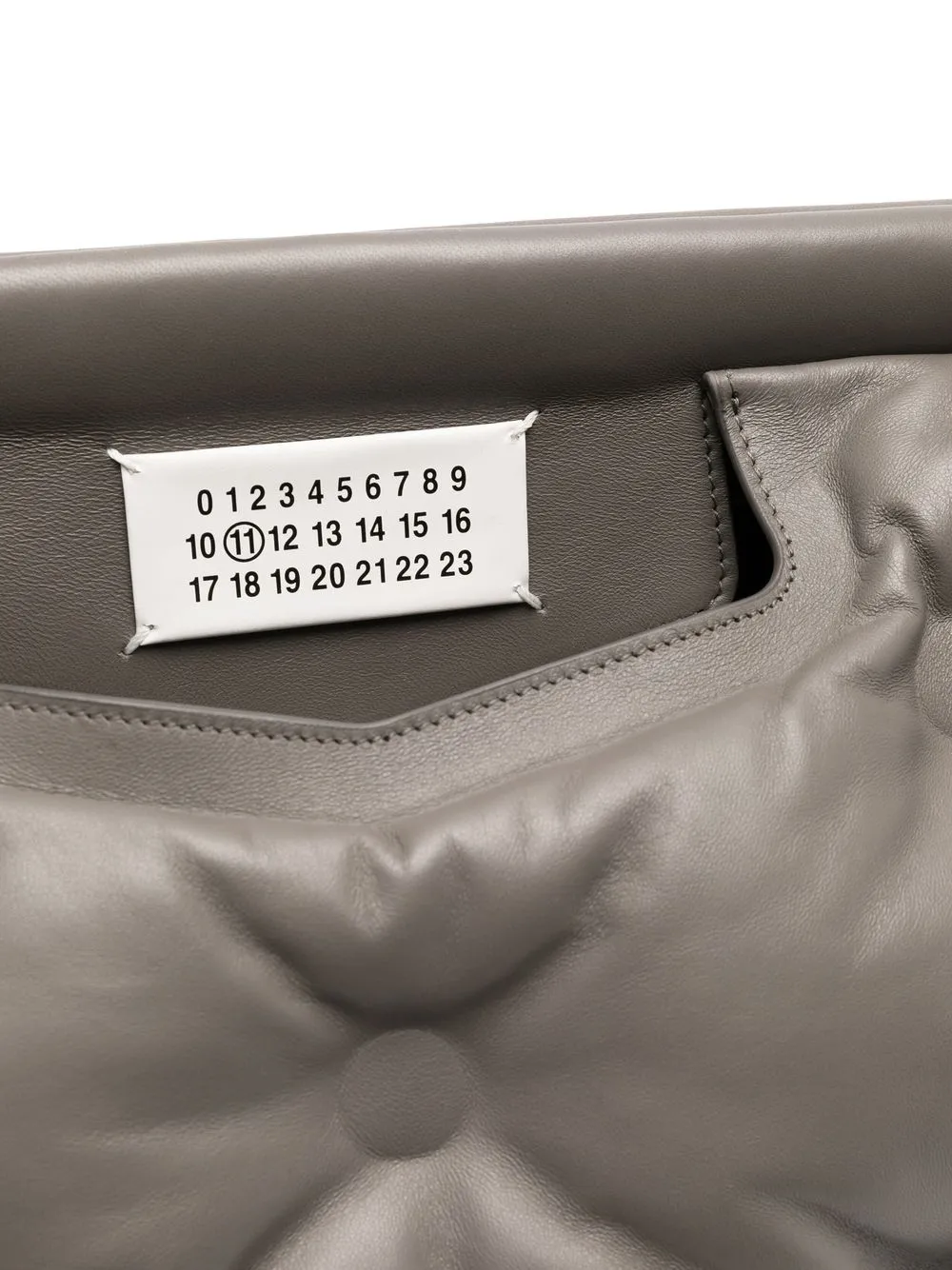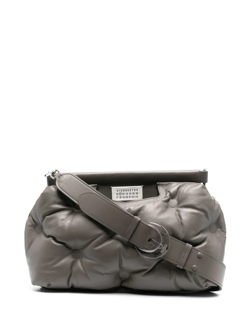 Gris, cuir de veau, design matelassé, patch logo sur le devant, anse à découpe sur le dessus, compartiment principal, bride porté épaule détachable et ajustable, pochette détachable.
