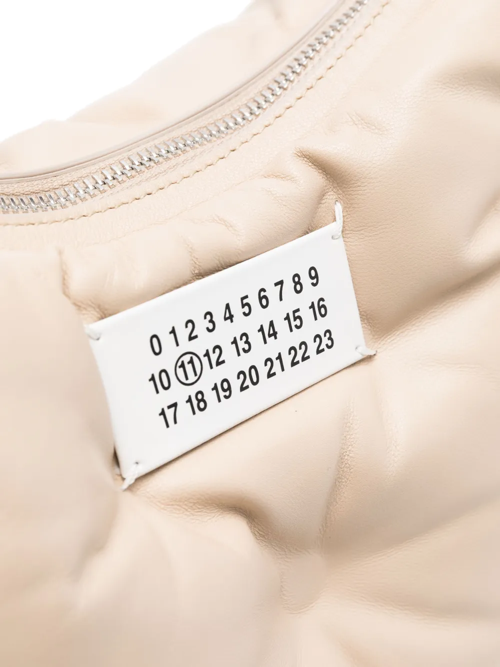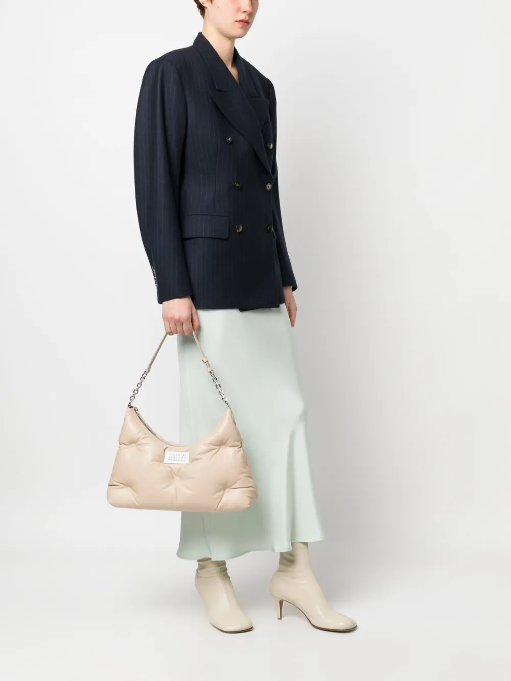 Amande, peau de mouton, cuir de veau, design matelassé, patch logo sur le devant, bride porté épaule en chaîne, logo brodé signature, fermeture zippée sur le dessus, poche interne zippée, compartiment principal.