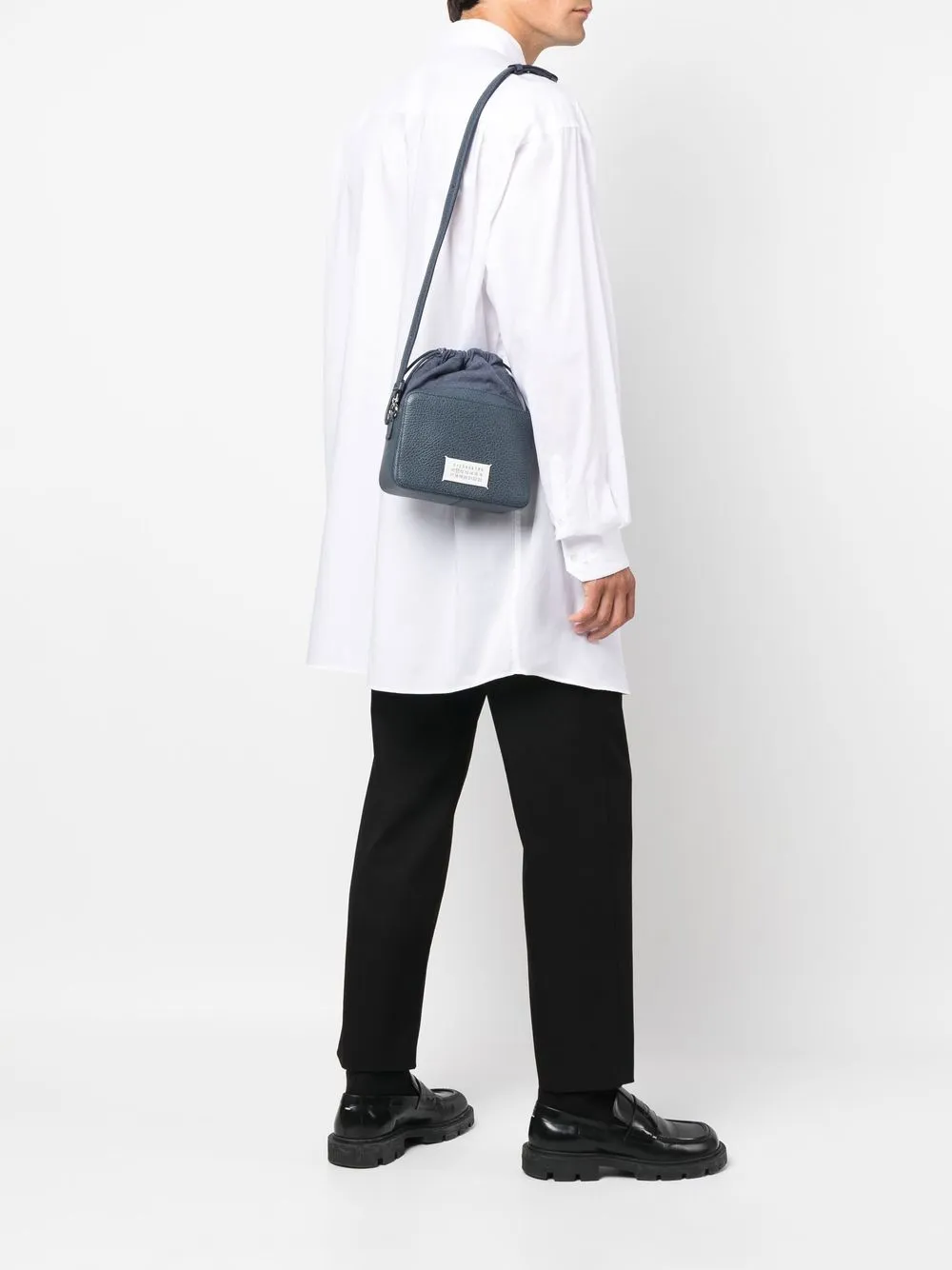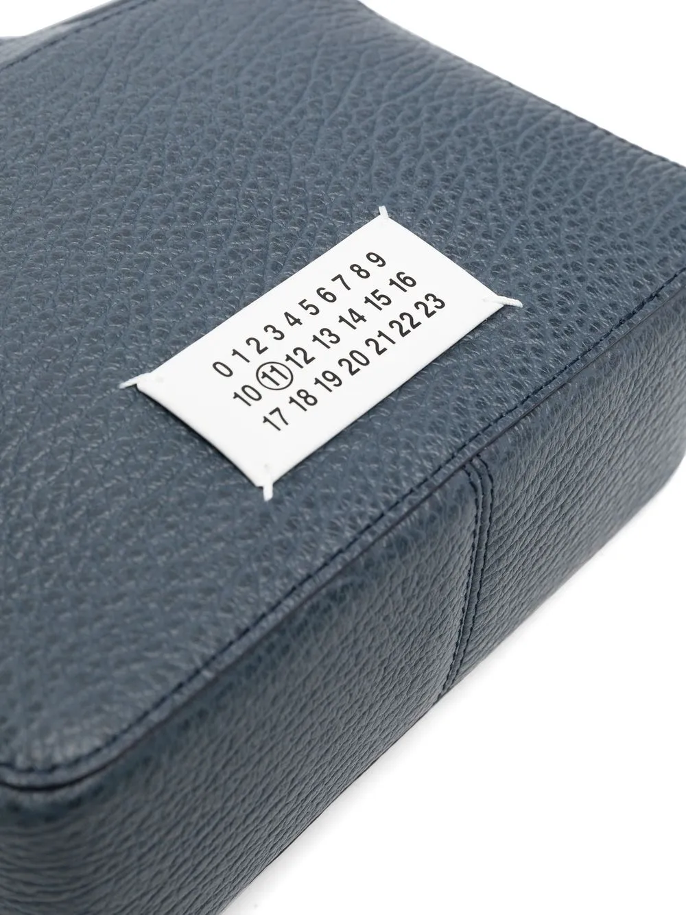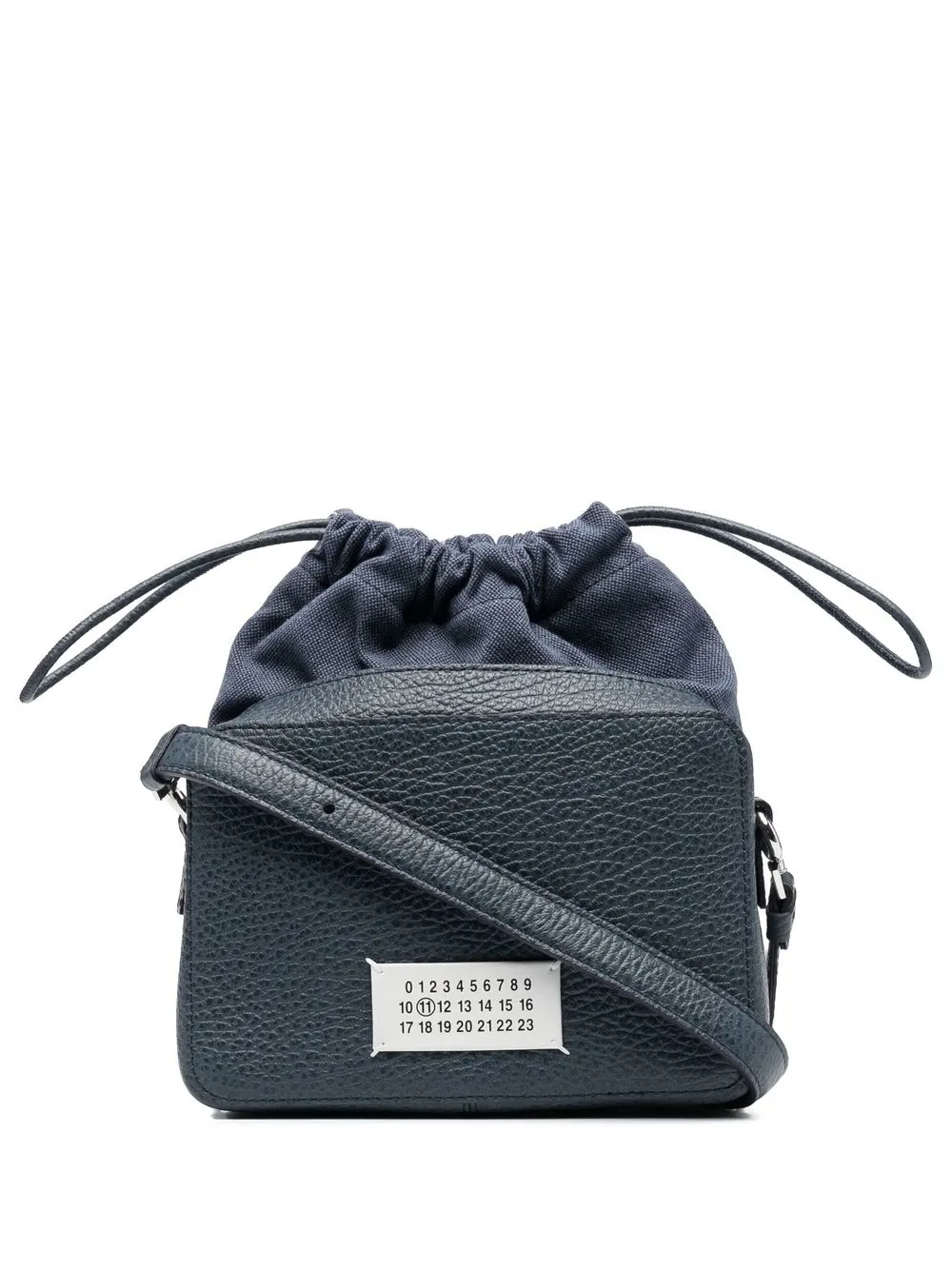 Cuir de veau, texture grainée, logo numéroté signature, lien de resserrage, fermeture zippée sur le dessus, compartiment principal.