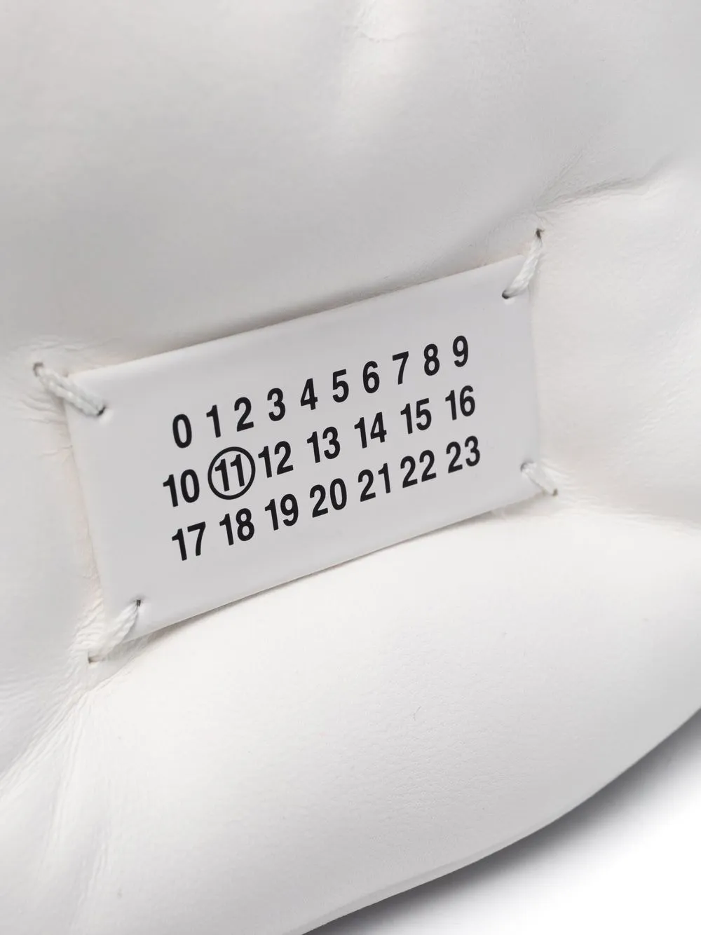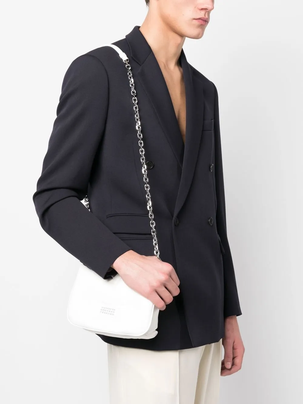 Blanc, cuir artificiel, design matelassé, design matelassé, logo numéroté signature, rabat sur le dessus, bride porté épaule en chaîne, compartiment principal.