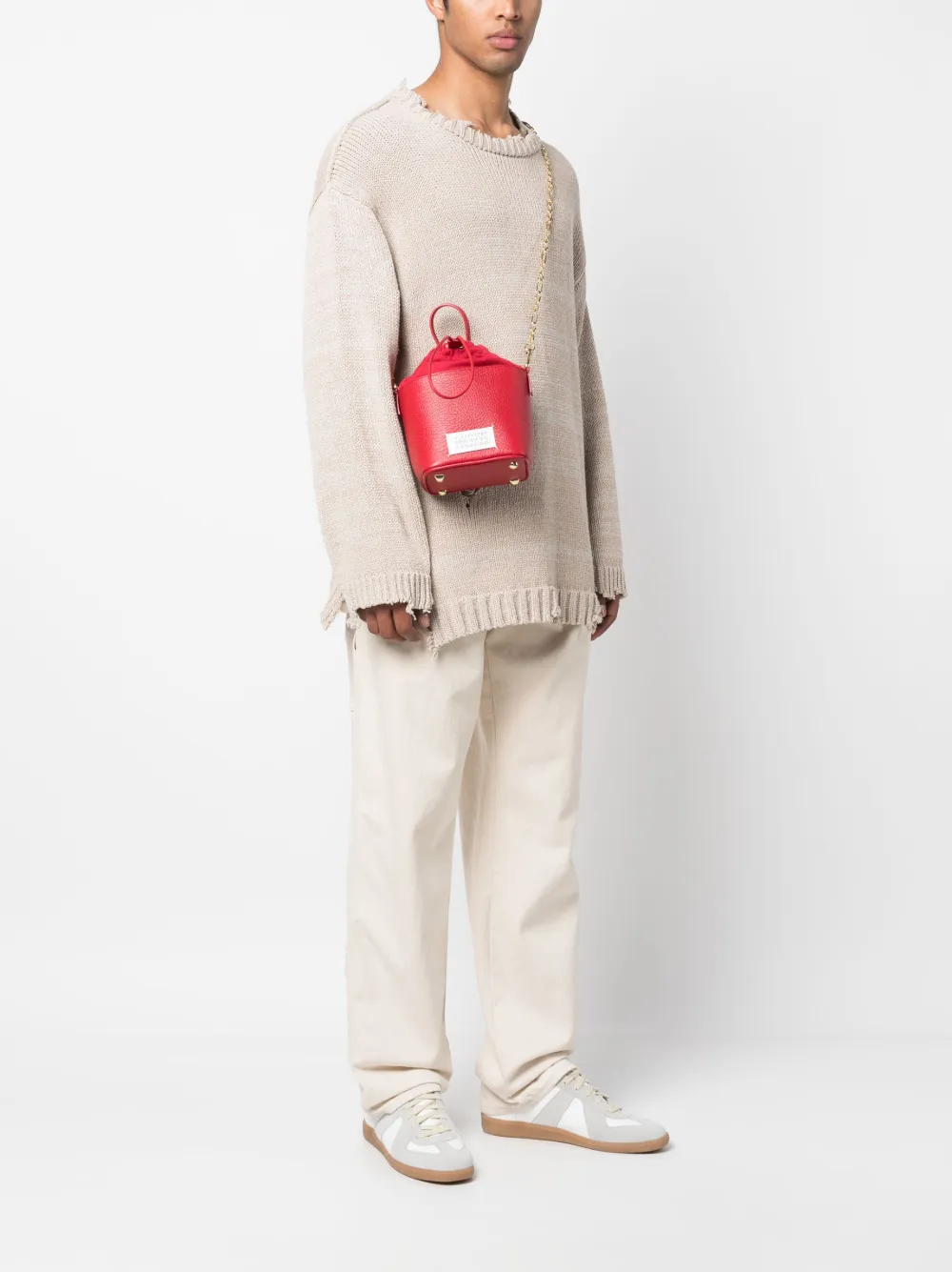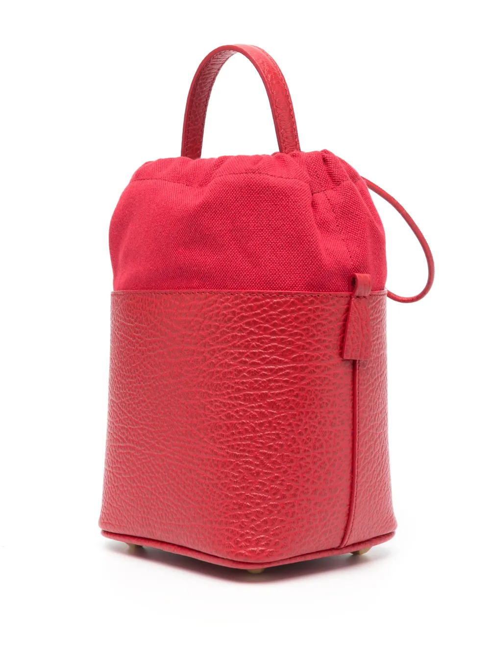 Rouge coquelicot, cuir de veau, coton, texture grainée, plaque logo, logo imprimé à l’intérieur, pieds en métal, lien de resserrage sur le dessus, bride porté épaule en chaîne, poche intérieure plaquée, compartiment principal.