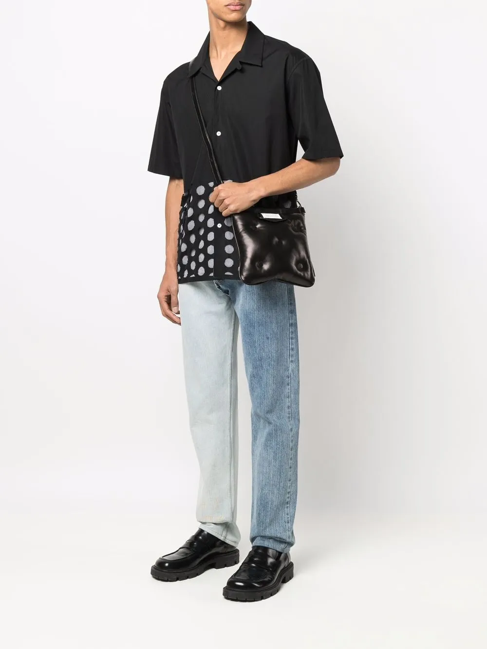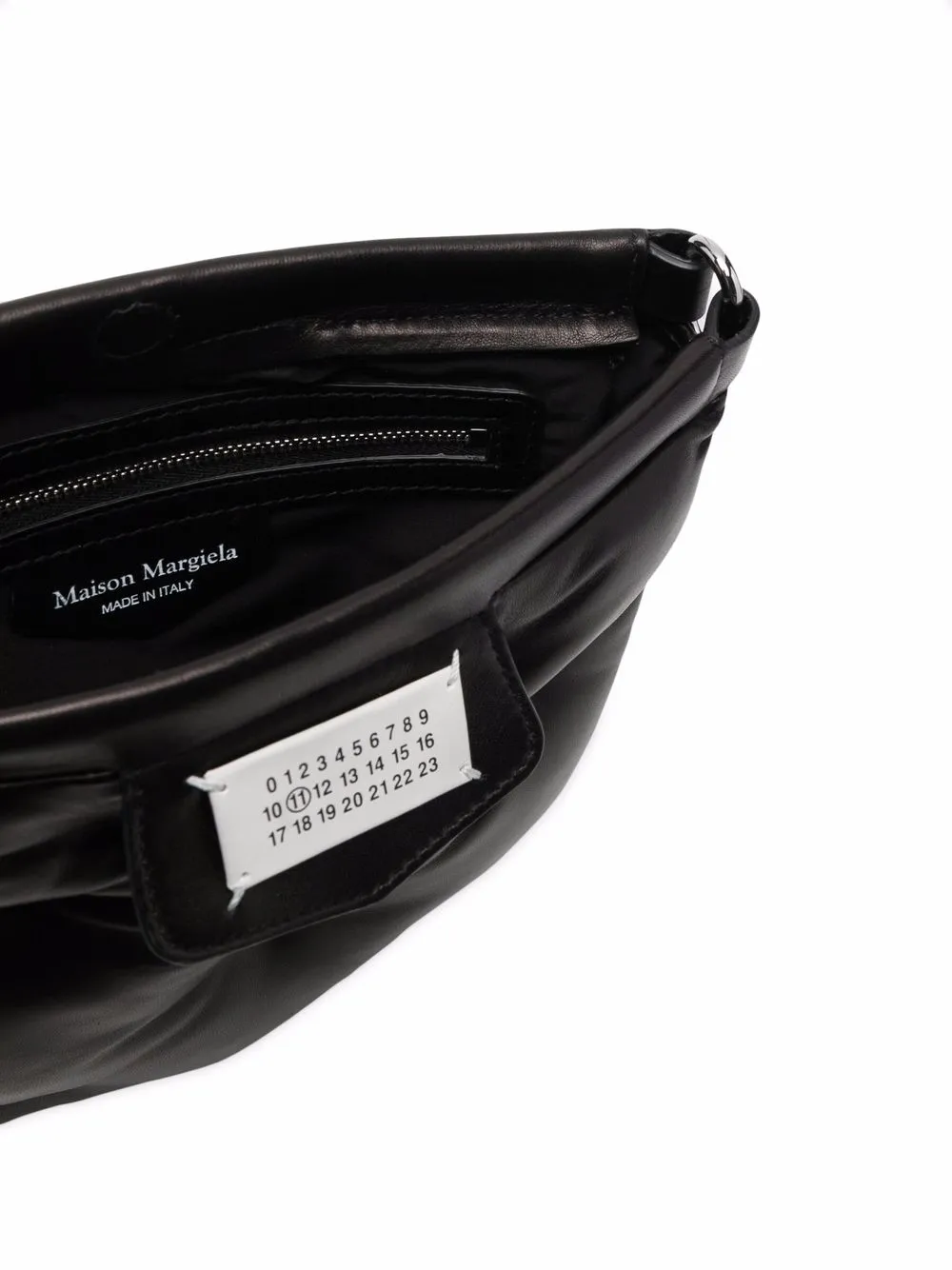 Design matelassé, patch logo sur le devant, ouverture sur le dessus, bretelle portée épaule unique, compartiment principal, poche intérieure zippée, doublure en cuir.