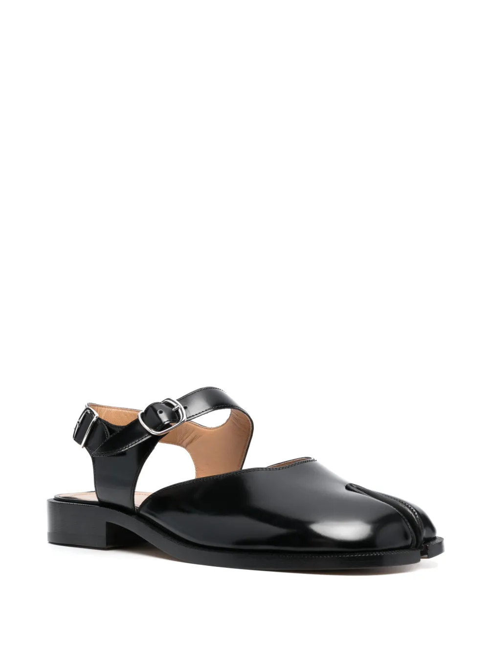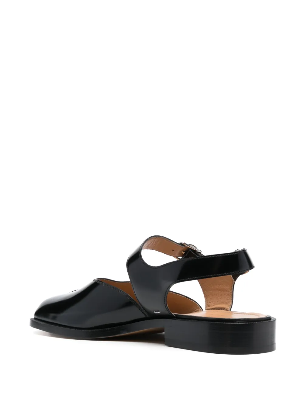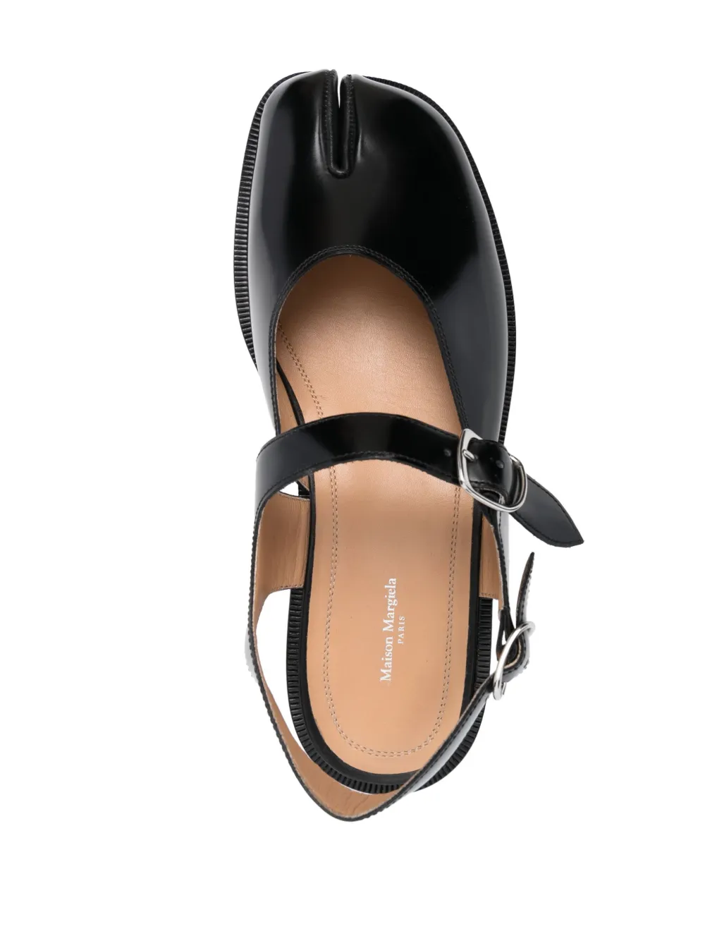 Noir, cuir de veau, bout Tabi signature, bride cheville à boucle, semelle intérieure griffée, semelle plate en cuir.