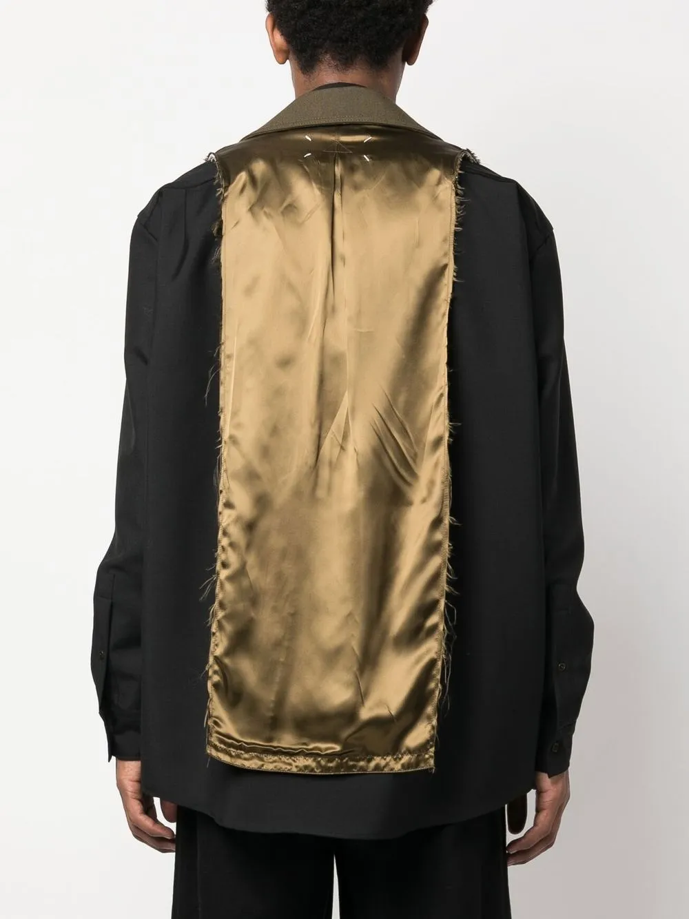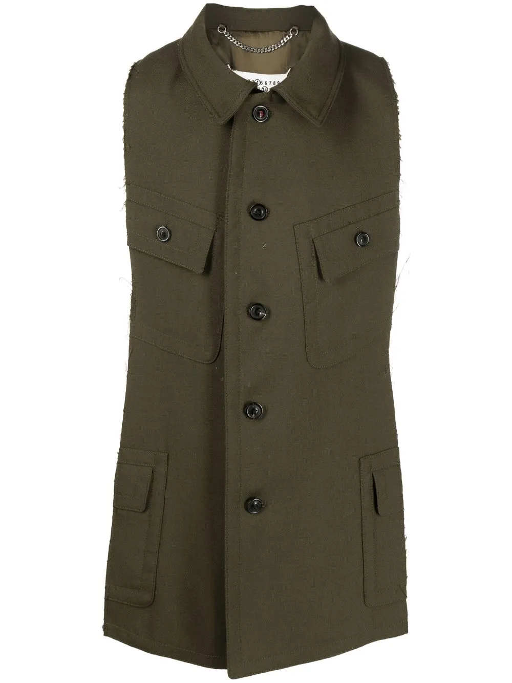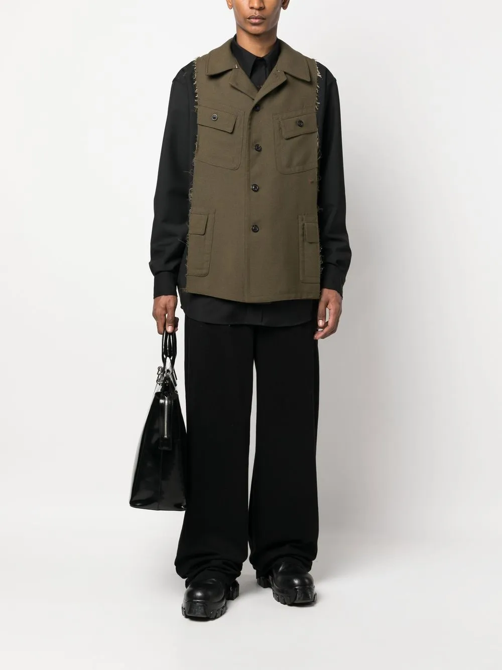 Kaki, bleu marine, coton, laine, col classique, deux poches poitrine à rabat, manches détachables, manches longues, poignets boutonnés, design à empiècements.