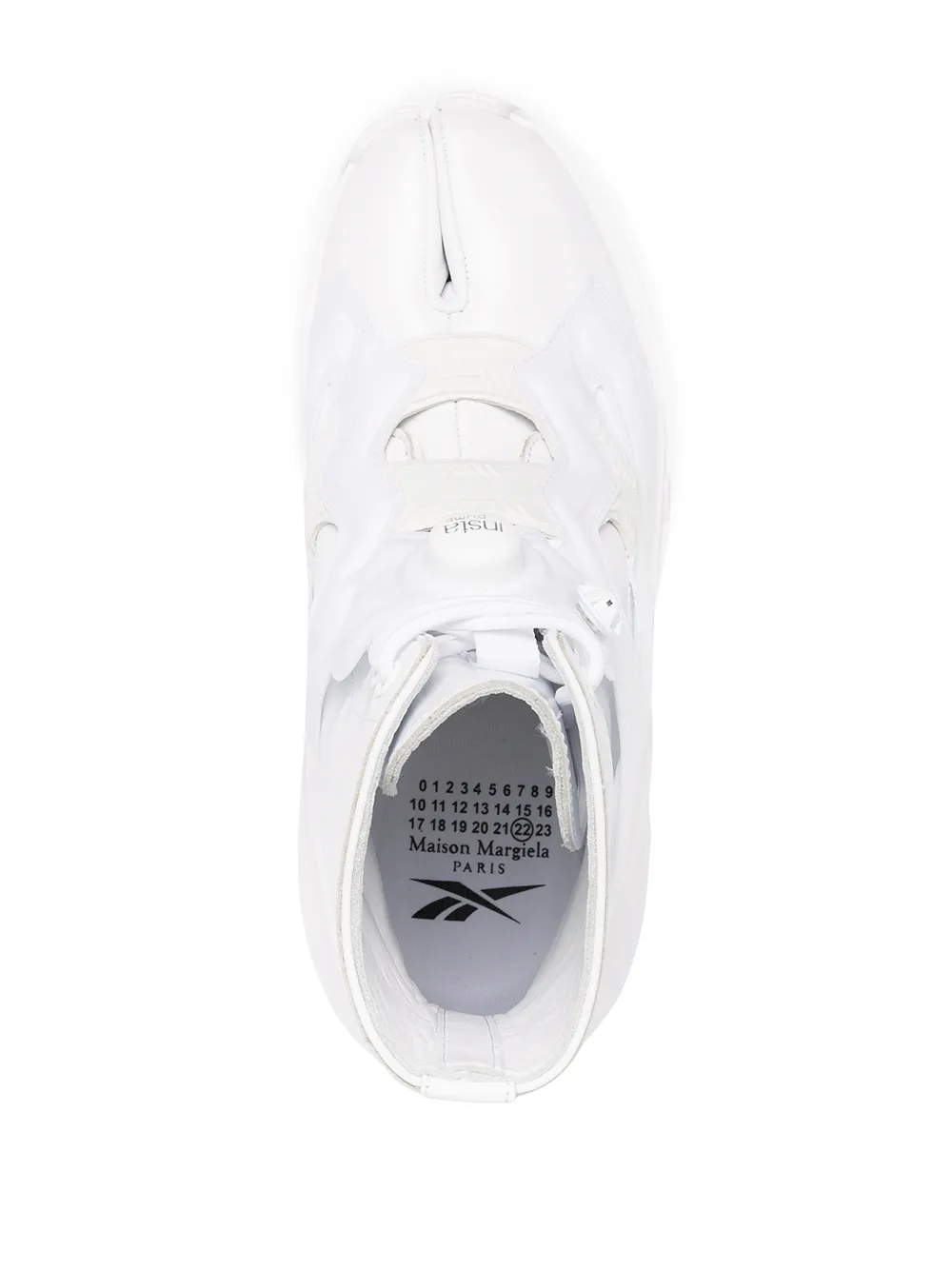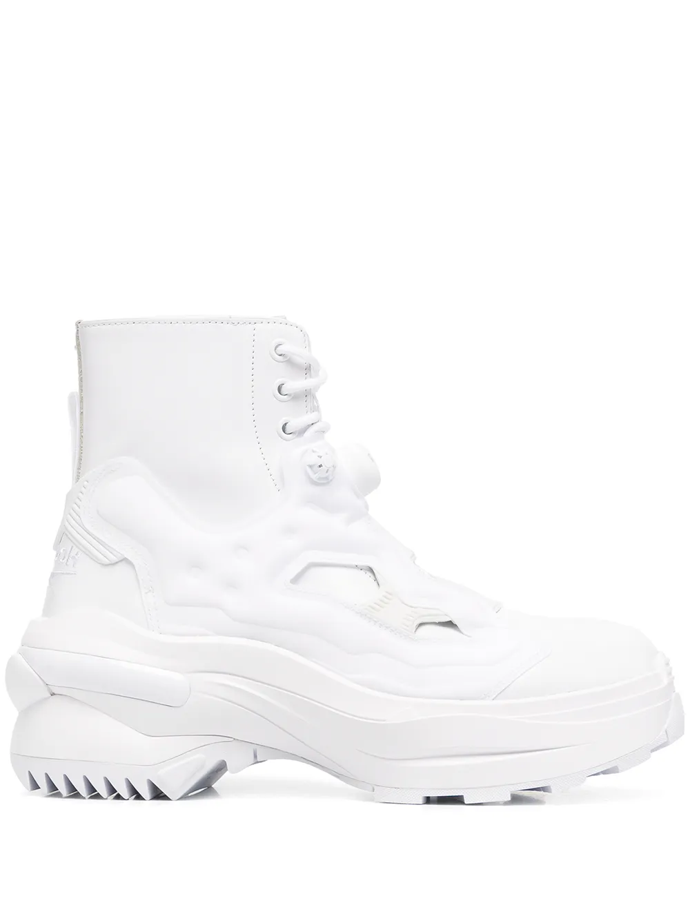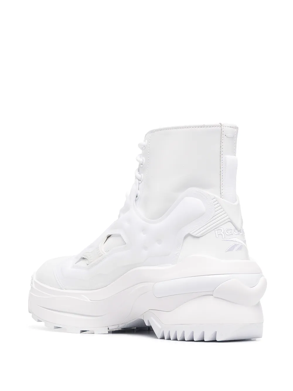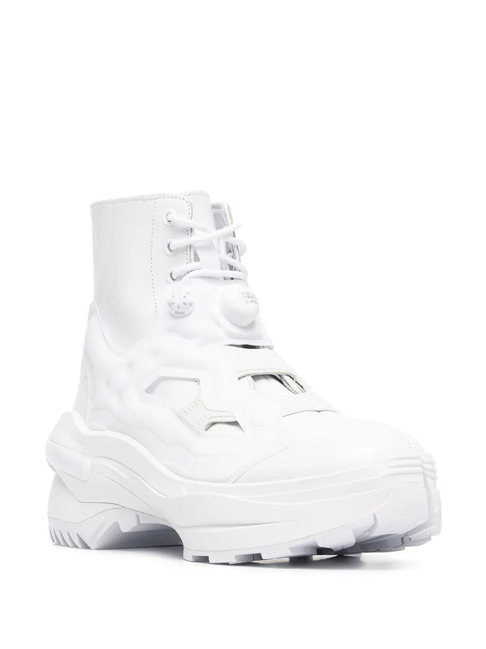 Design à empiècements, logo brodé à l’arrière, semelle épaisse en caoutchouc, fermeture à lacer sur le devant, longueur cheville. Couleur : blanc.