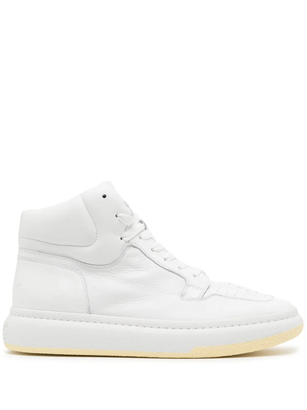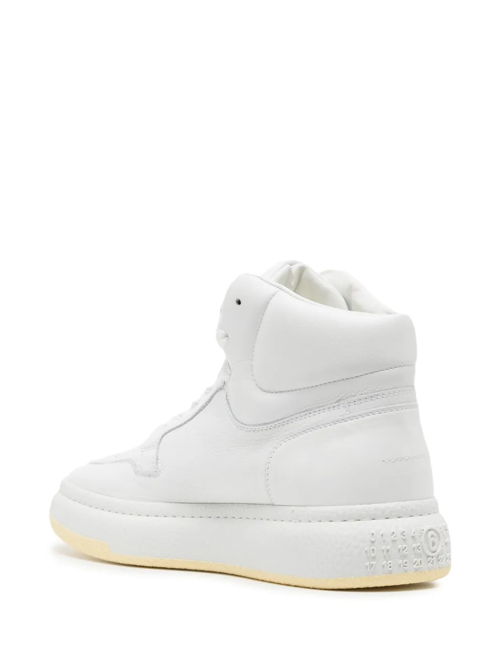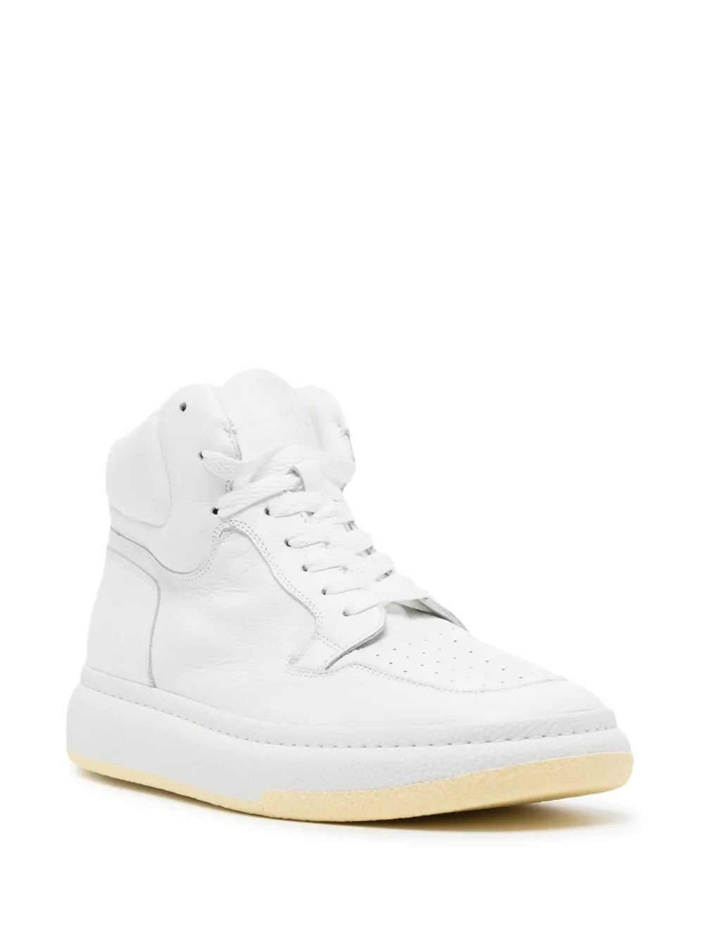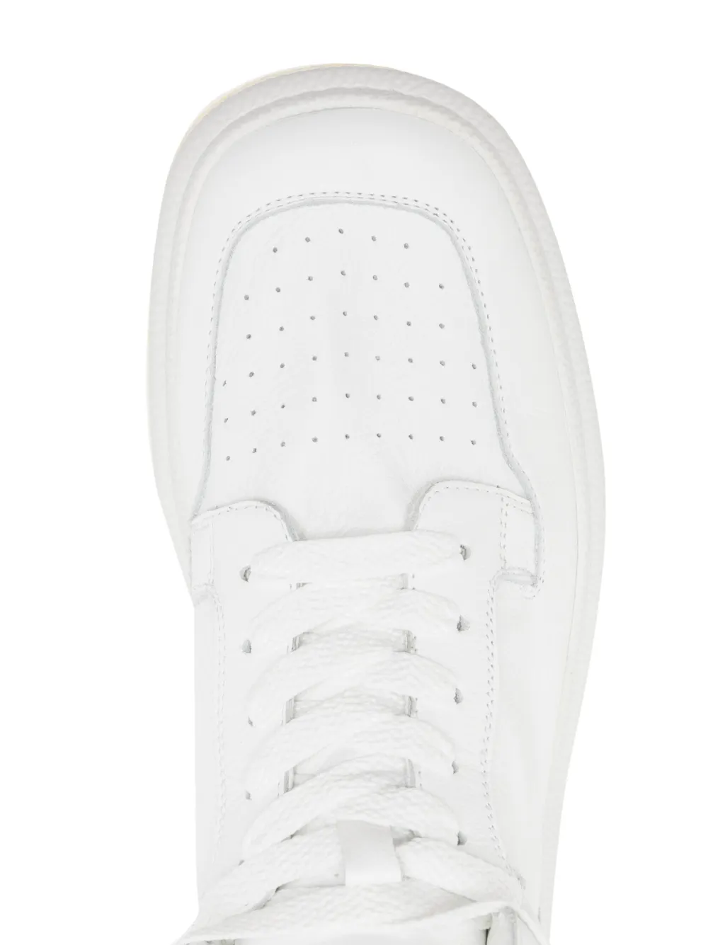 Blanc, cuir de veau, logo numéroté signature, détails de perforations, bout carré, fermeture à lacer sur le devant, semelle plate en caoutchouc, hauteur cheville.