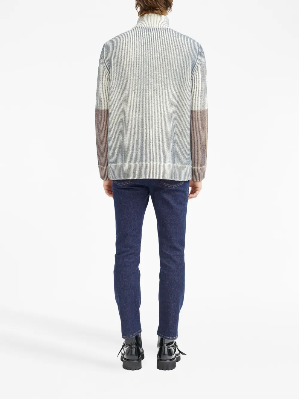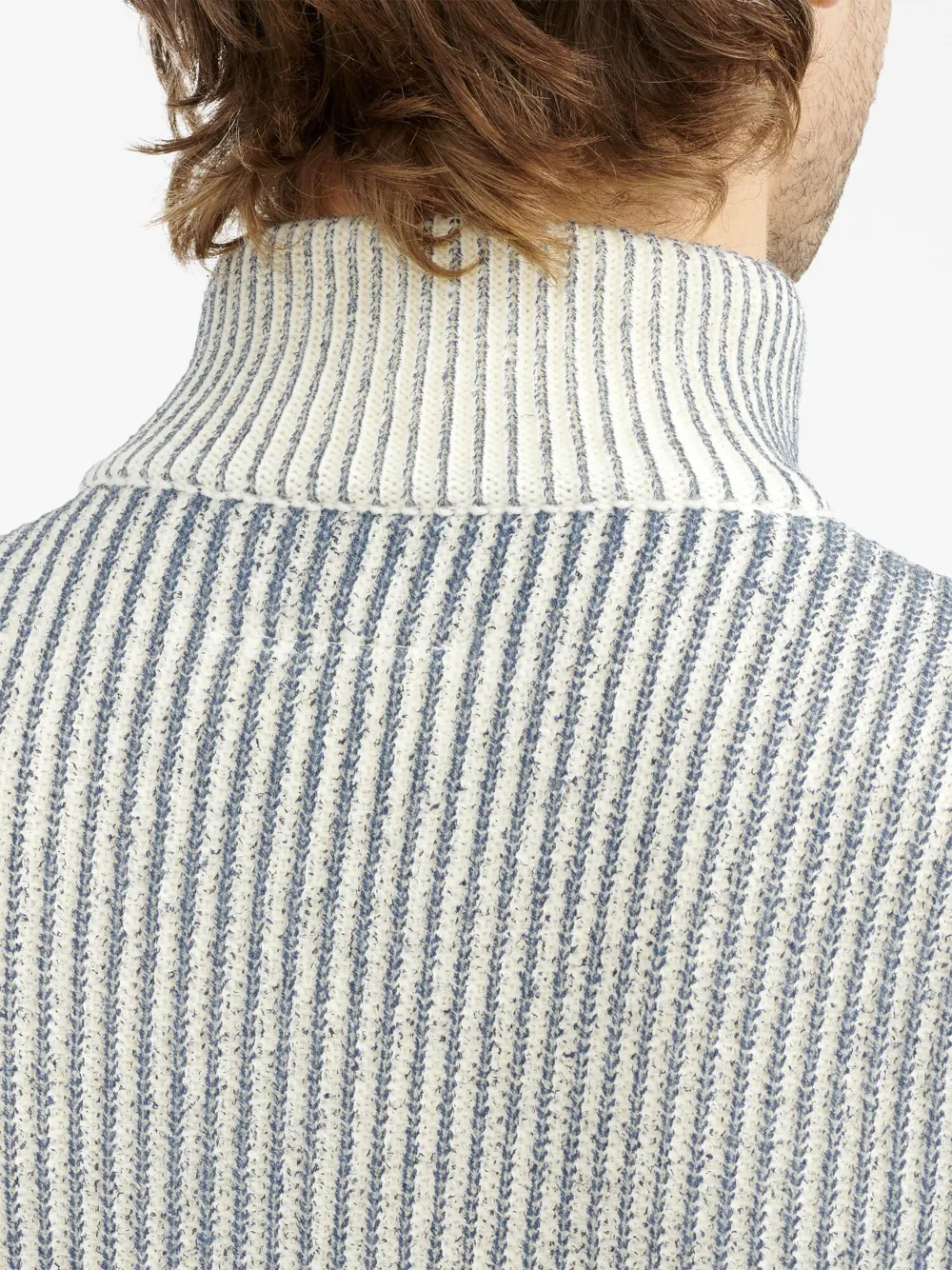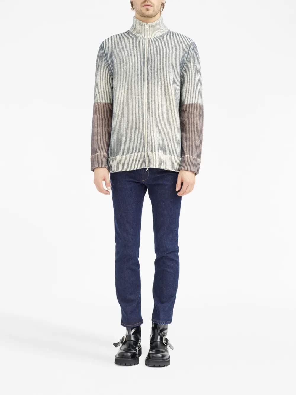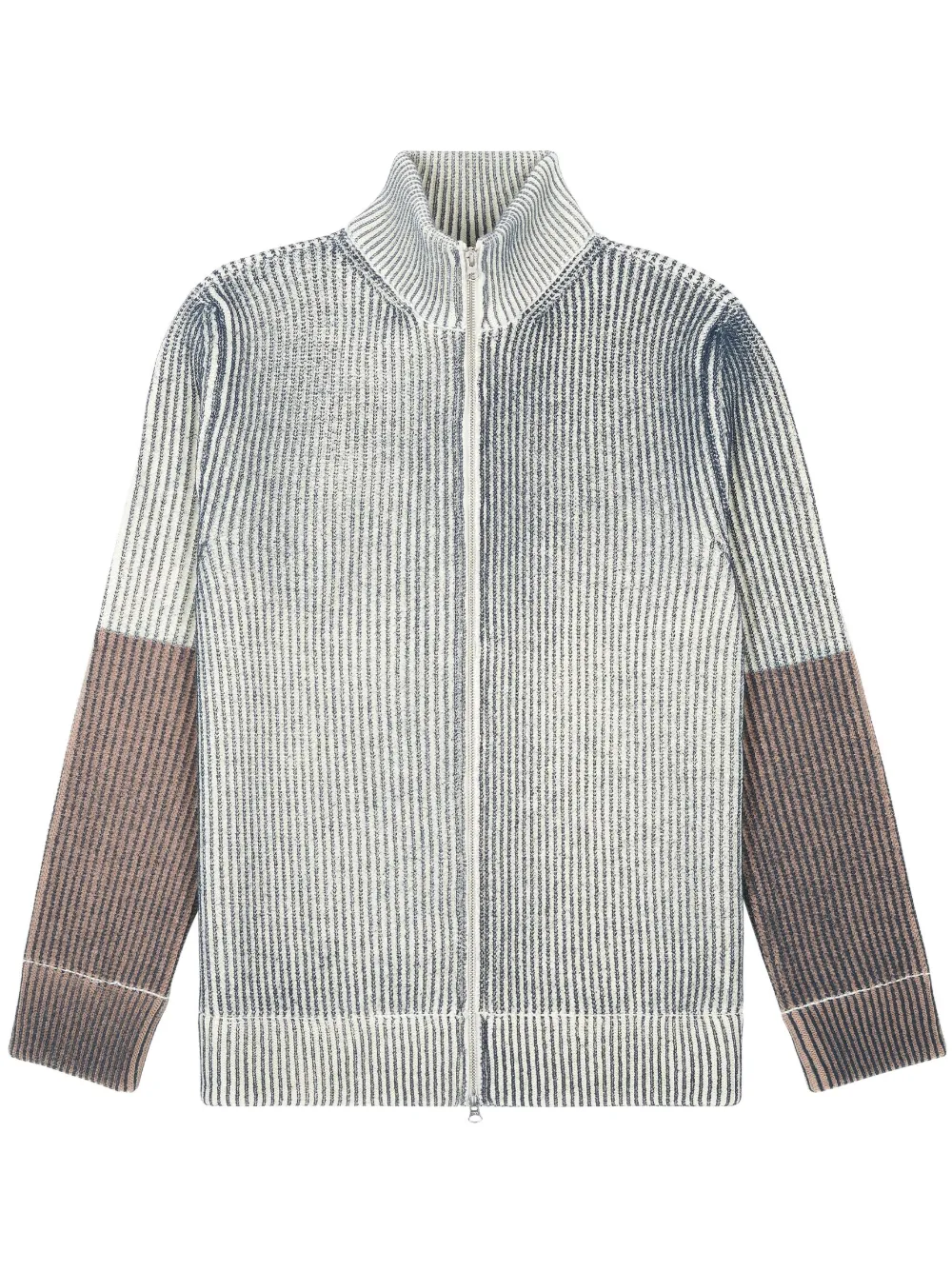 Blanc cassé, laine vierge mélangée, design en maille, maille nervurée, col montant, fermeture zippée devant, manches longues, ourlet droit.