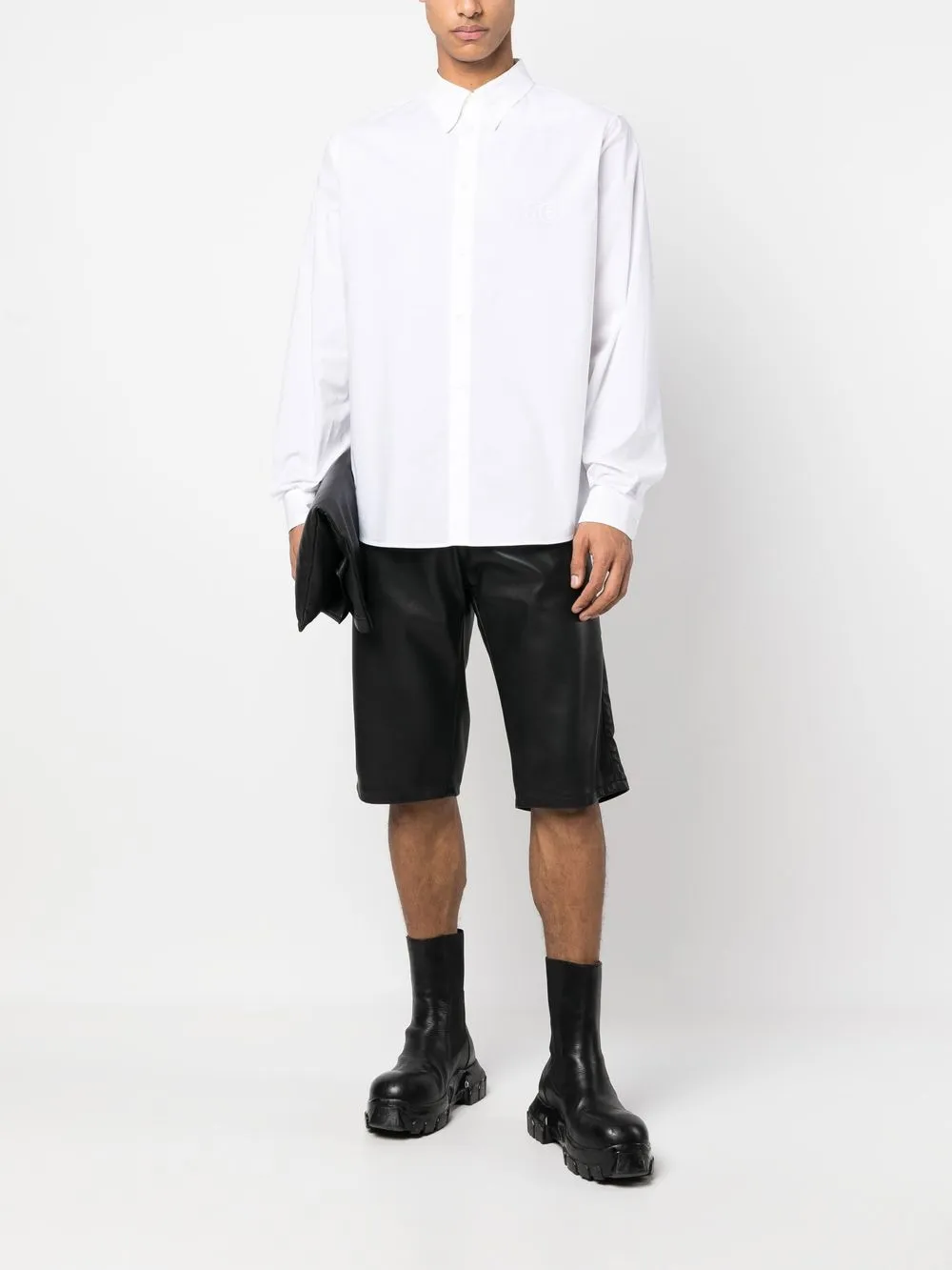 Blanc craie, coton, col classique, boutonnière sur le devant, manches longues, poignets boutonnés, ourlet incurvé.