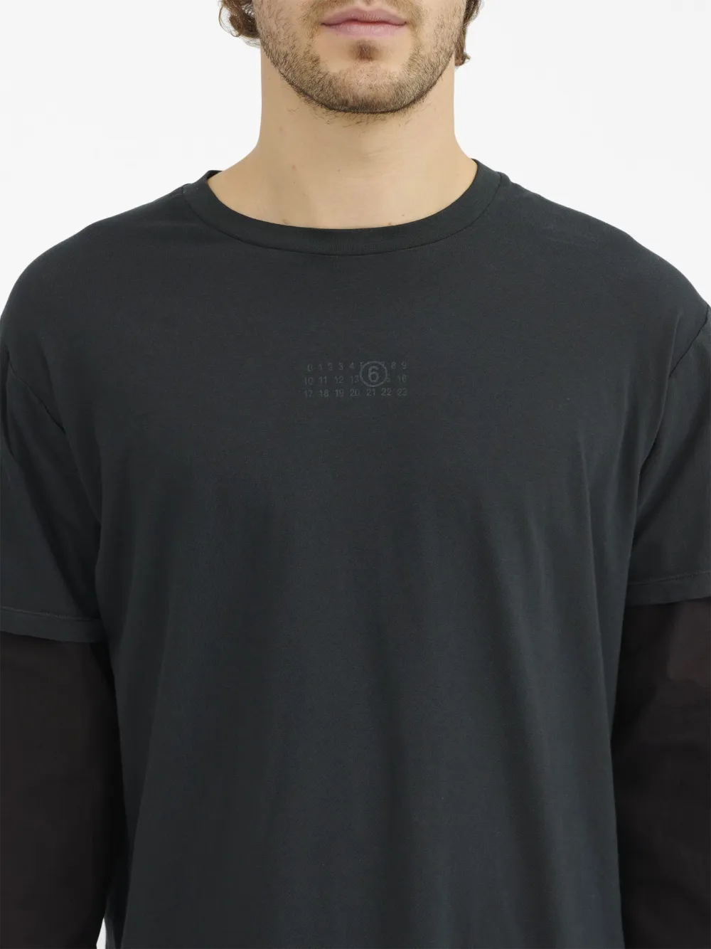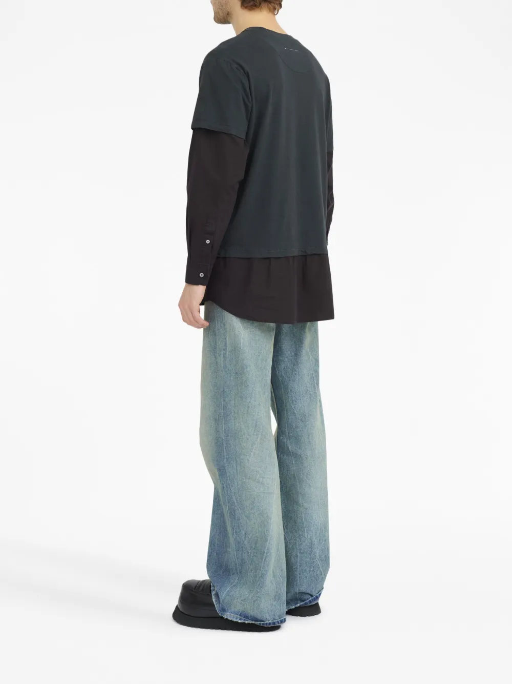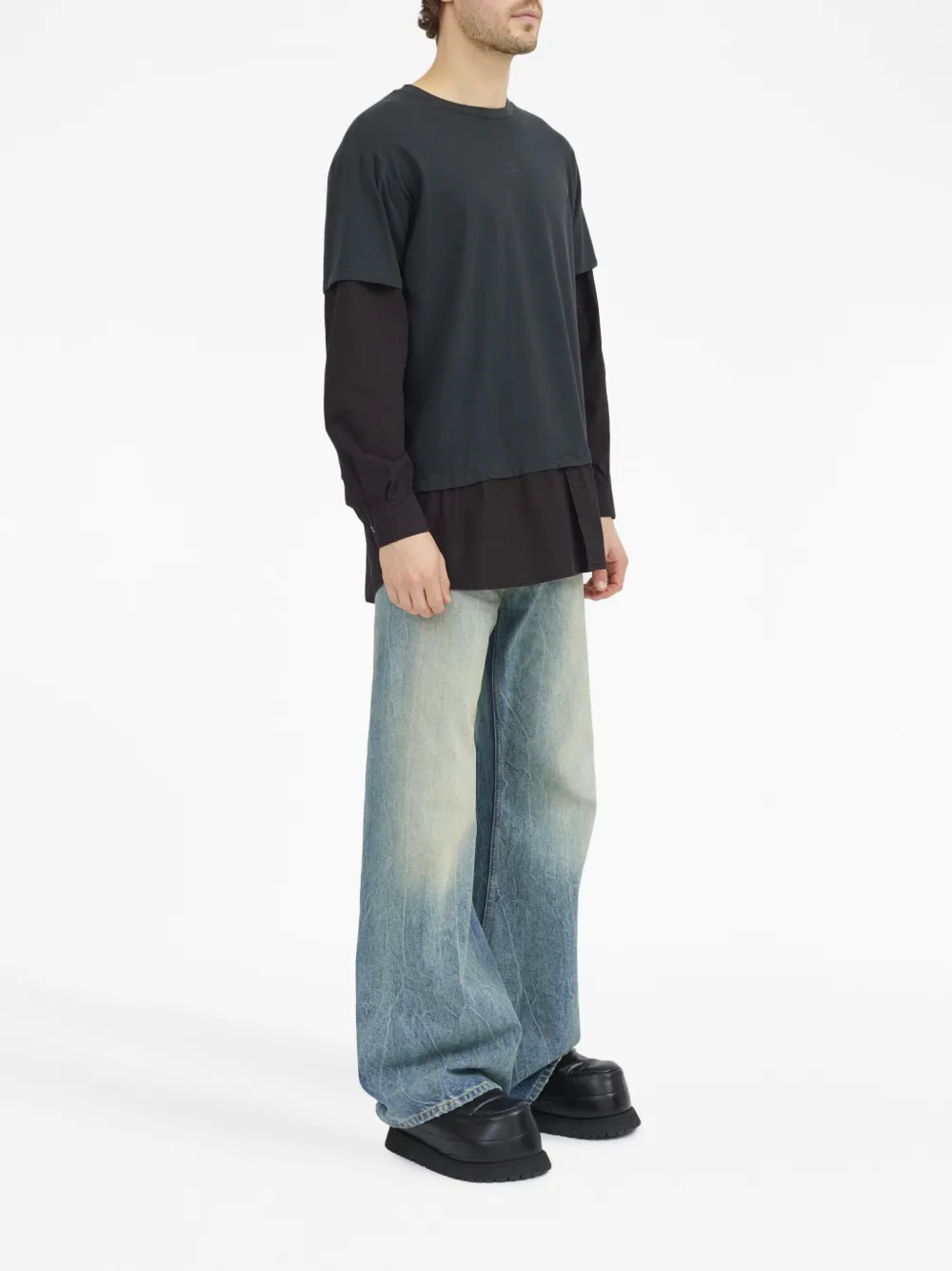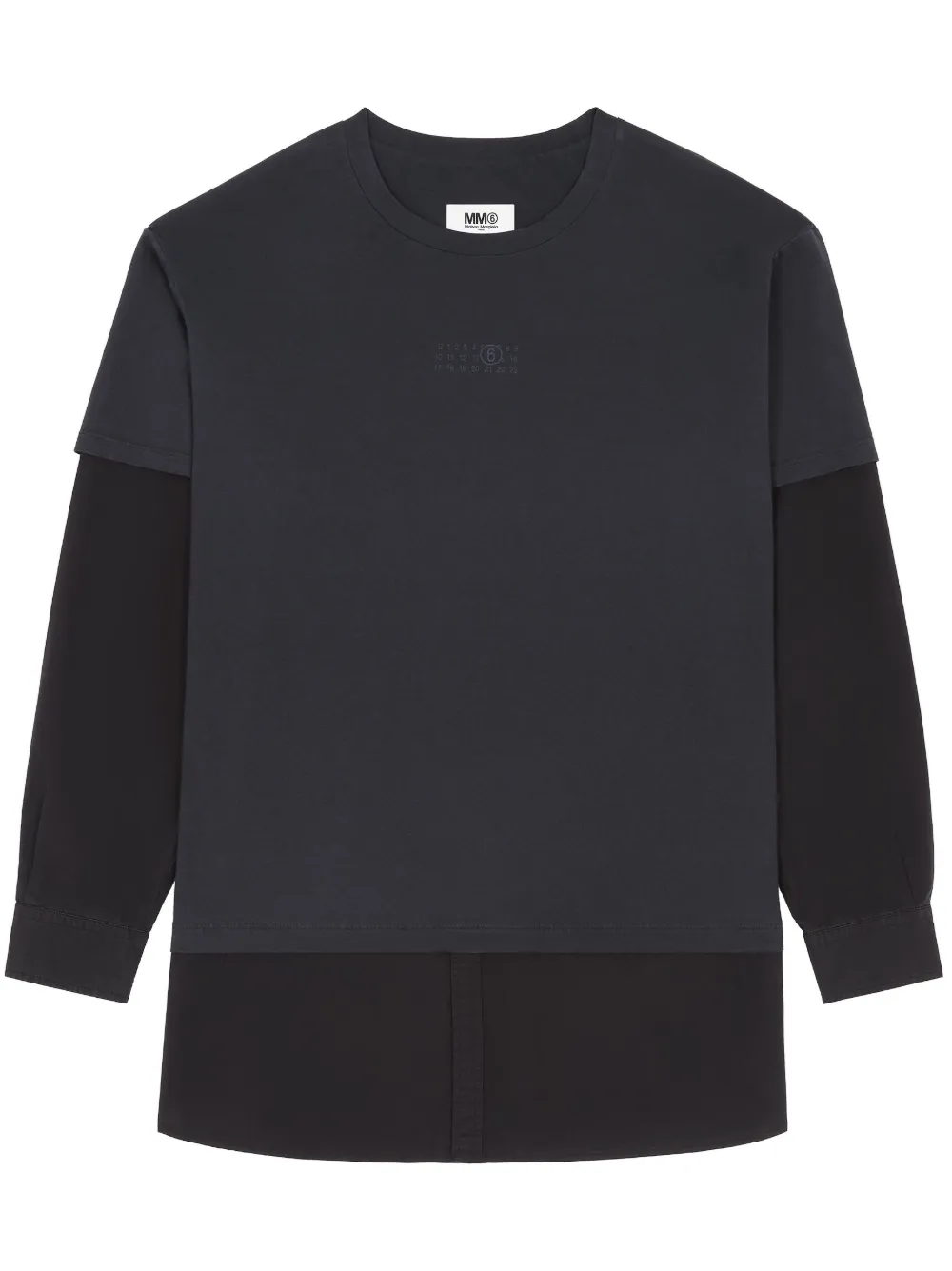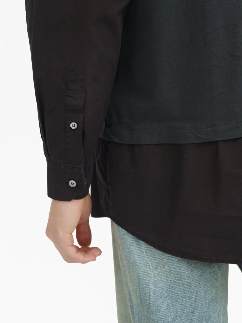 Noir, bleu marine, coton, effet superposé, logo numéroté signature, manches longues, poignets boutonnés, ourlet droit.