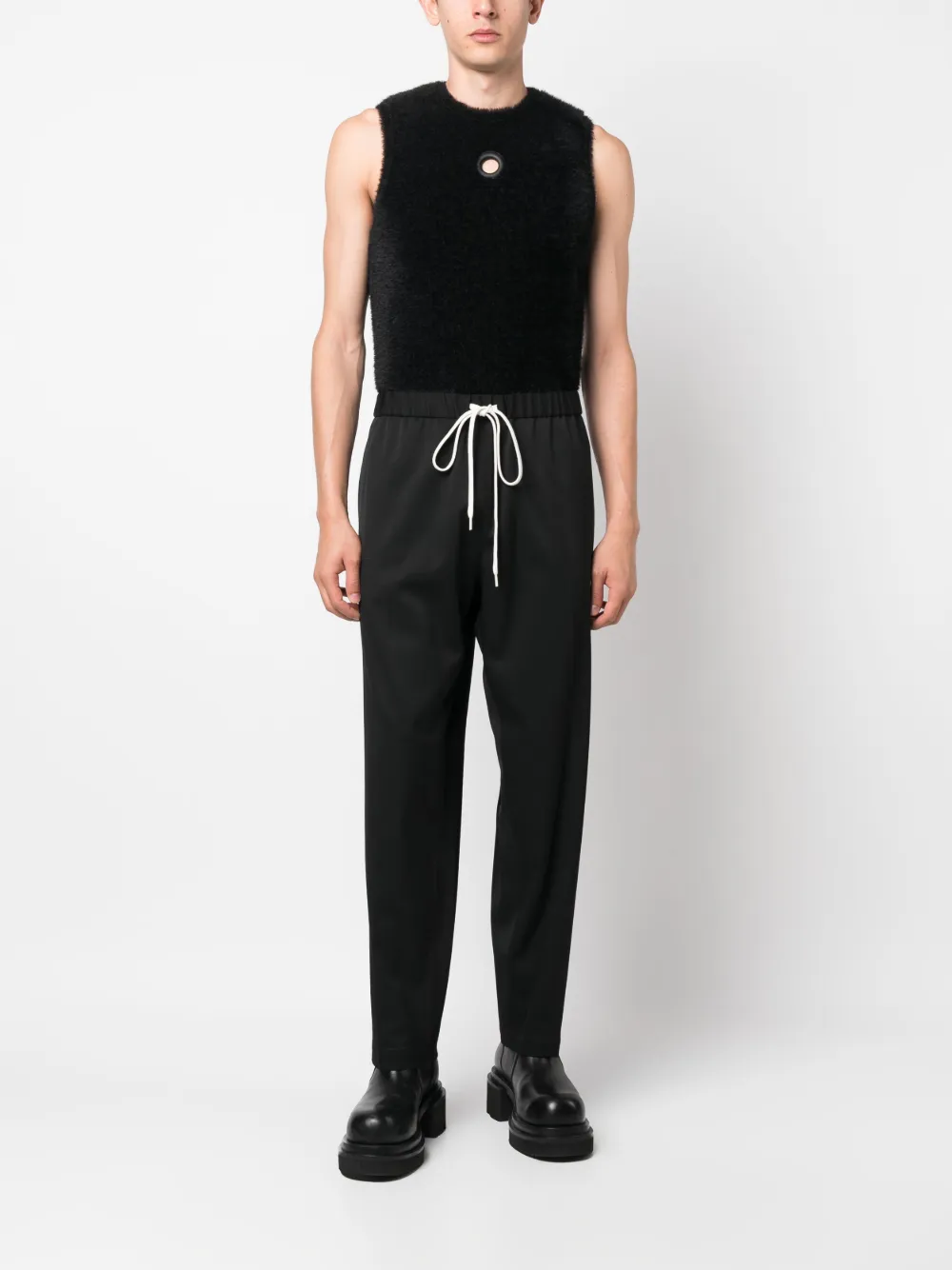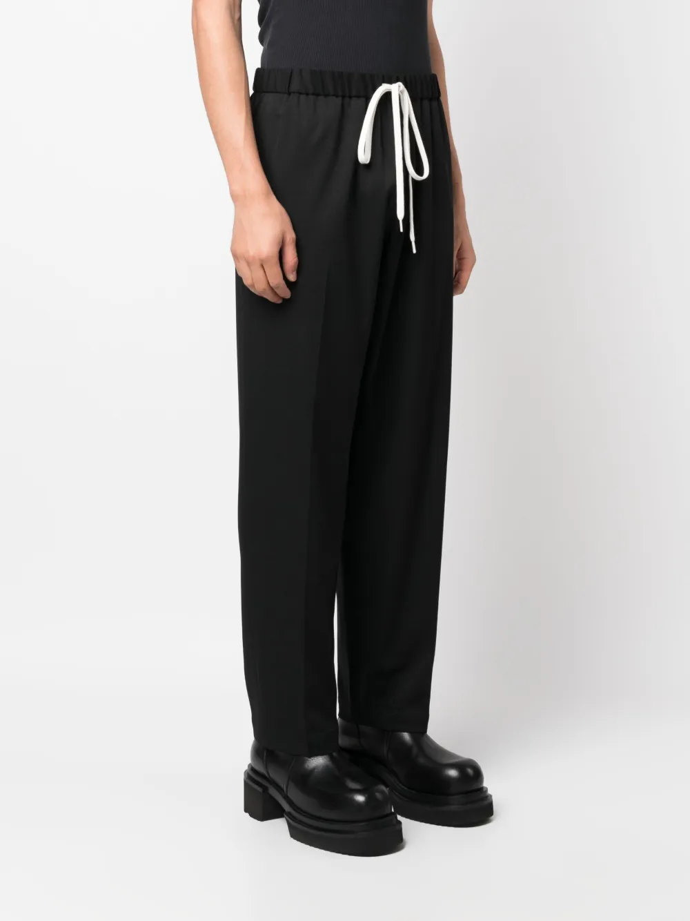 drawstring straight-leg trousers from MM6 Maison Margiela featuring black, cotton, low-rise, pressed crease, elasticated drawstring waistband, straight leg and rear patch pocket.