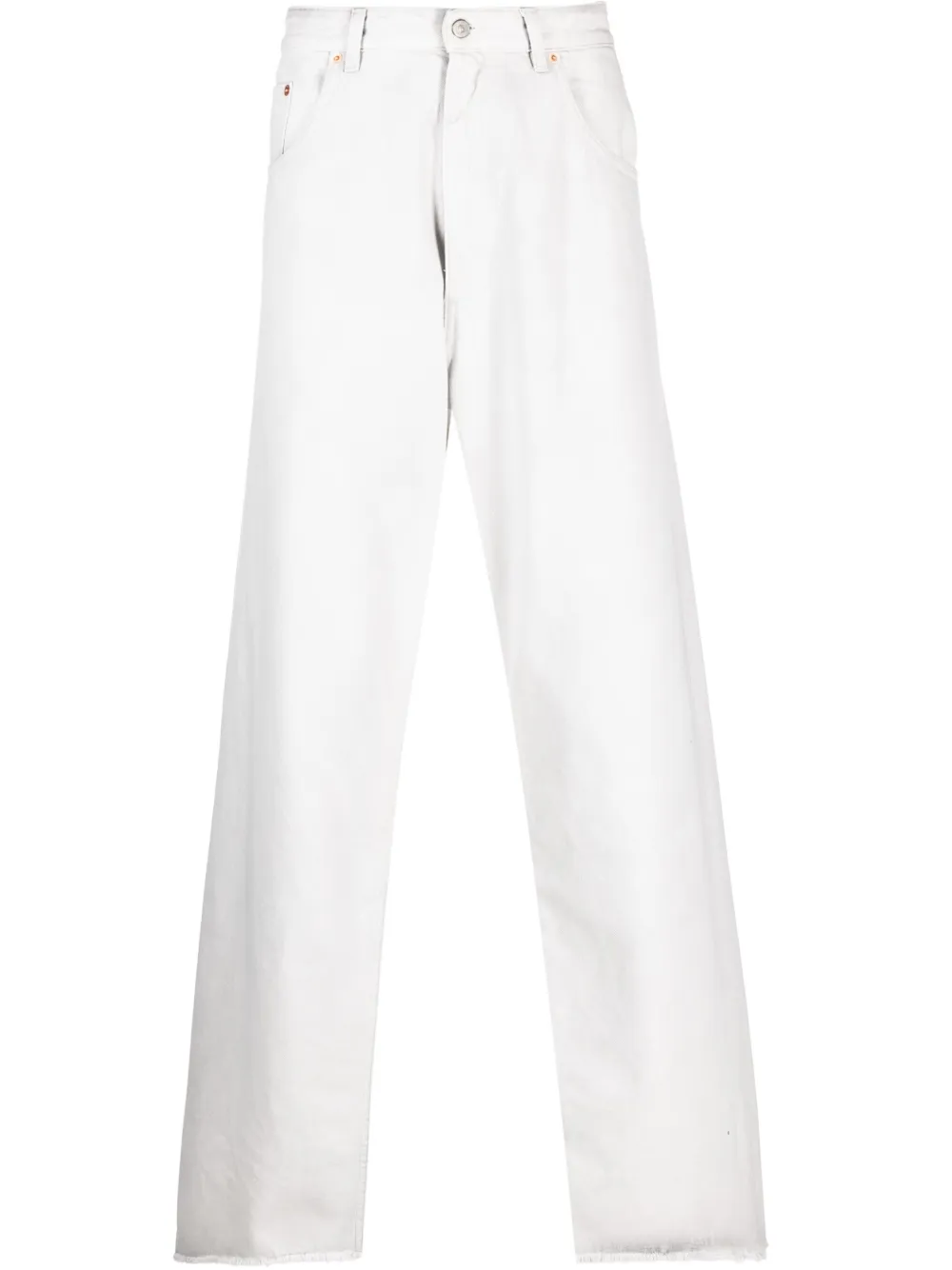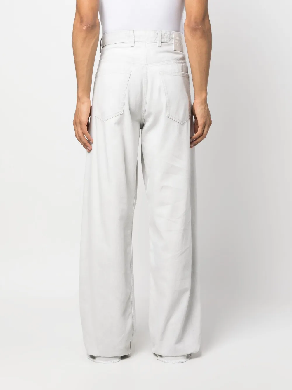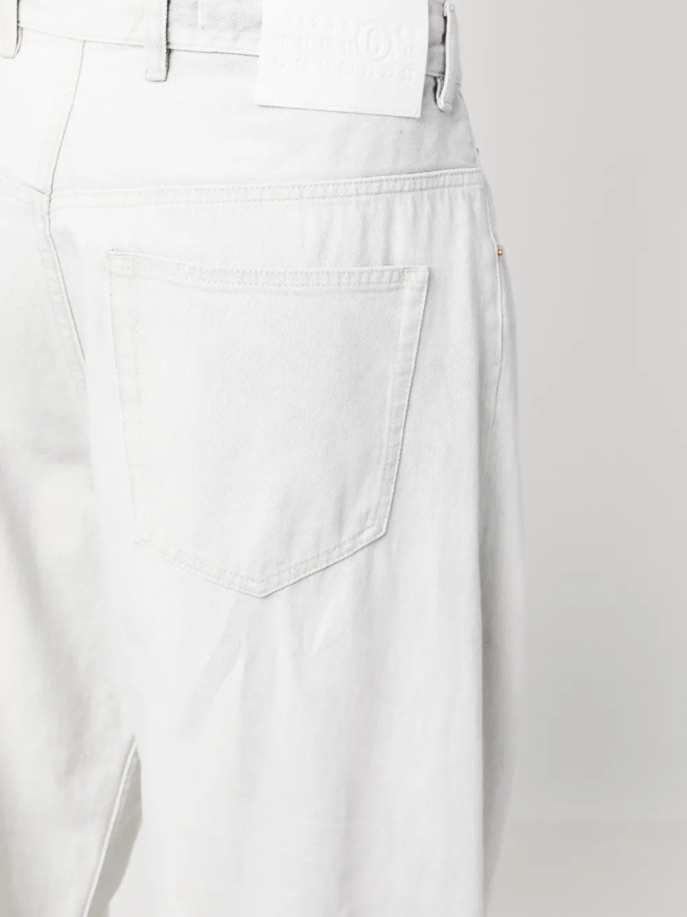 Blanc cassé, coton, patch logo sur l’arrière, passants de ceinture, taille basse, coupe ample, boutonnière sur le devant, cinq poches classiques.