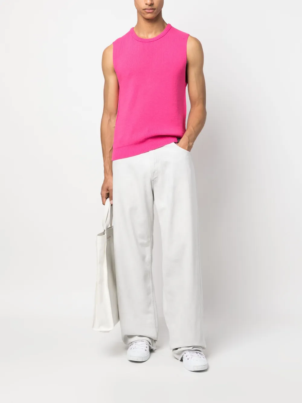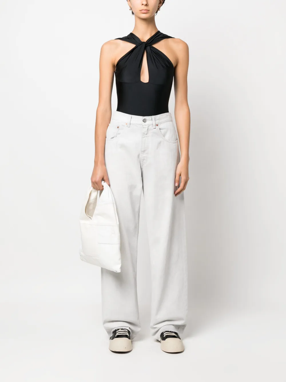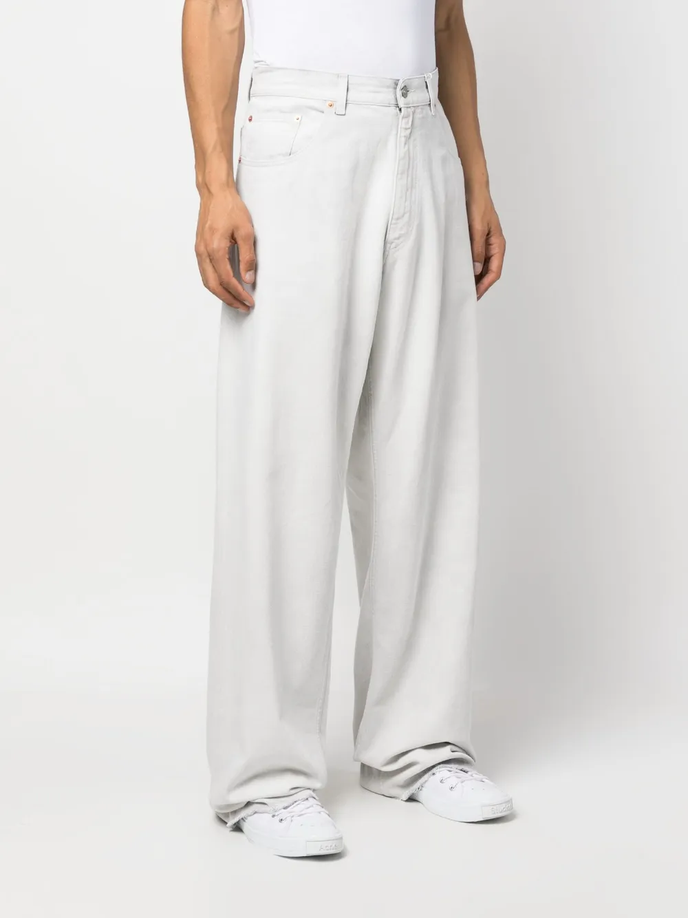 Blanc cassé, coton, patch logo sur l’arrière, passants de ceinture, taille basse, coupe ample, boutonnière sur le devant, cinq poches classiques.
