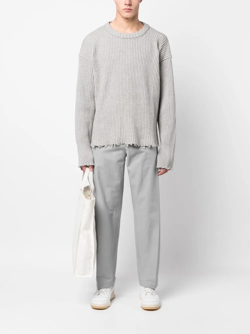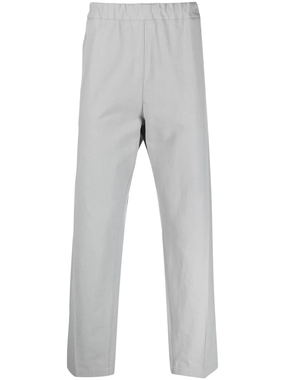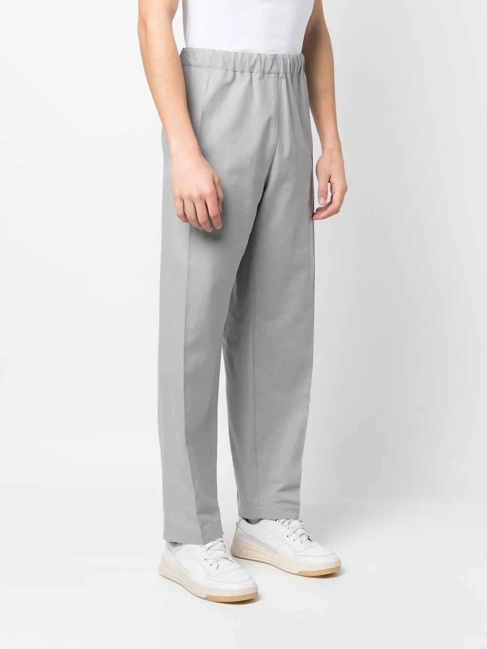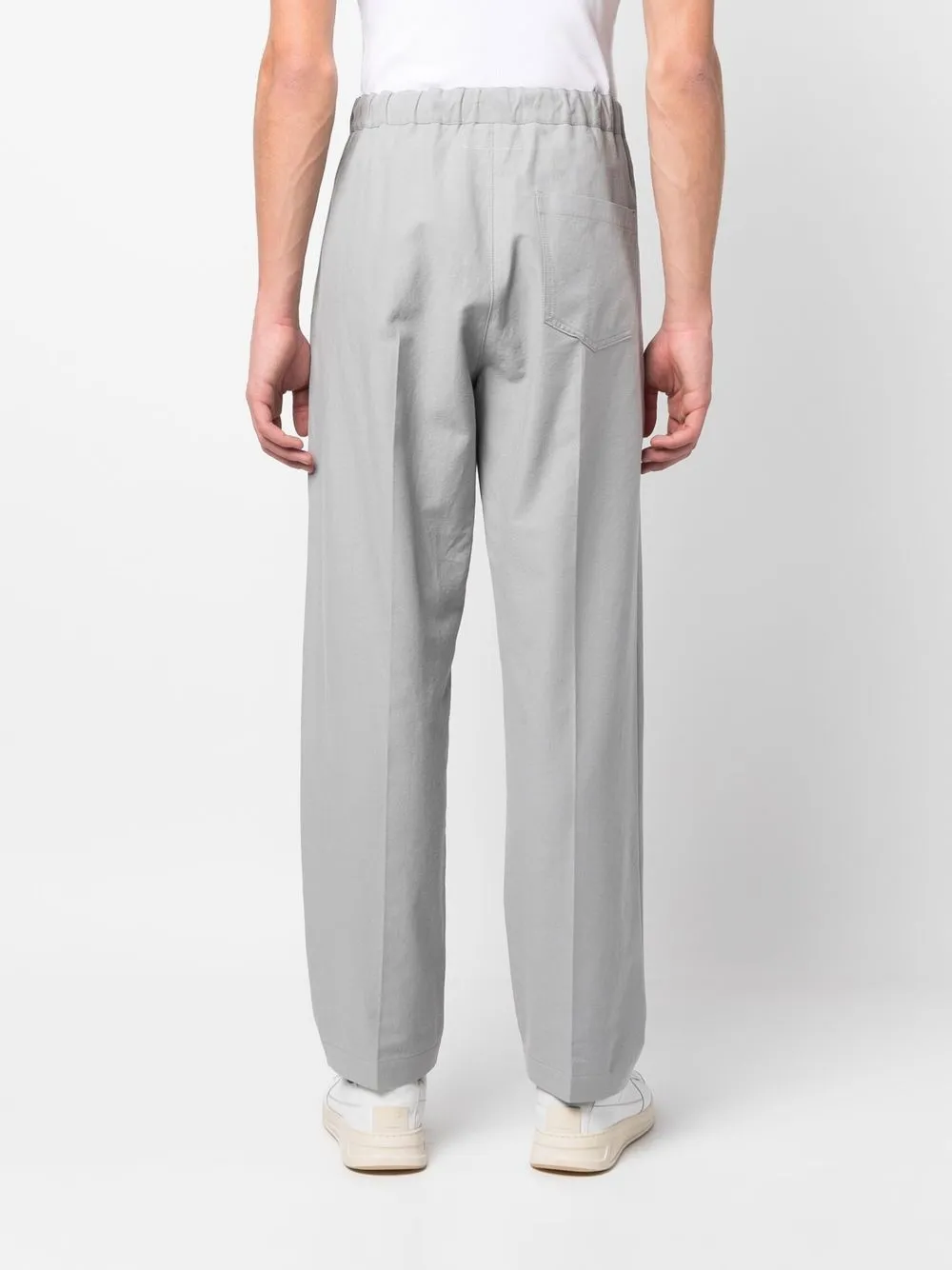 Gris perle, coton et soie mélangés, plis marqués, coutures contrastantes, ceinture élastique, coupe ample, poche arrière plaquée.