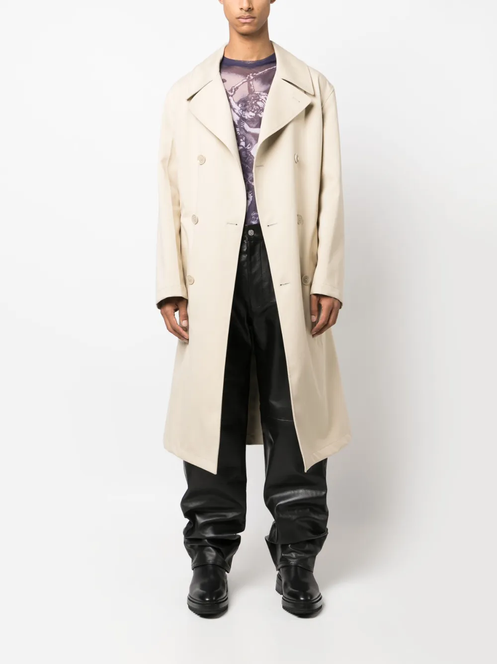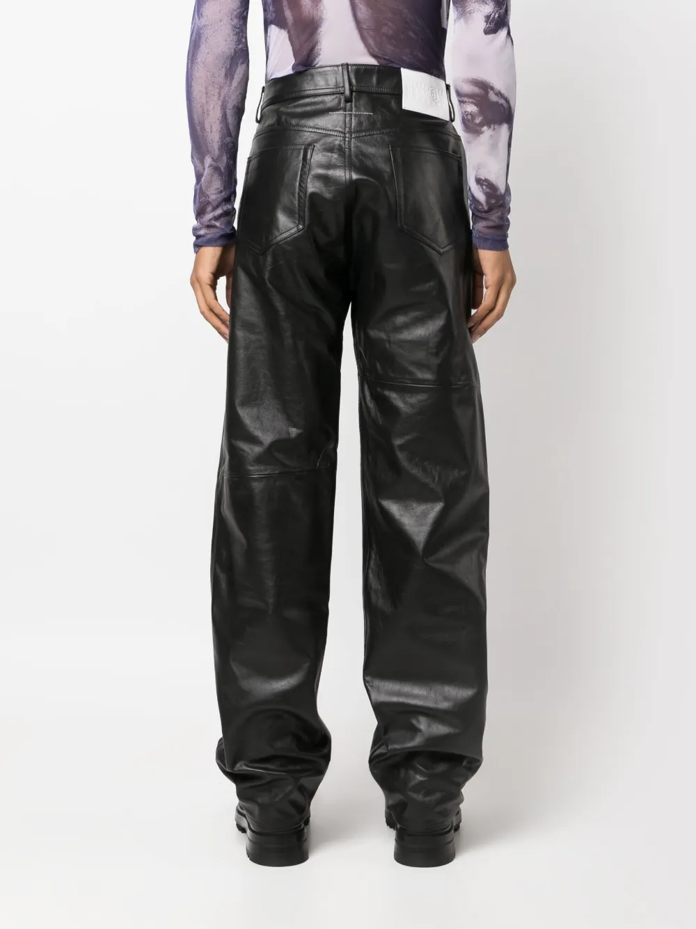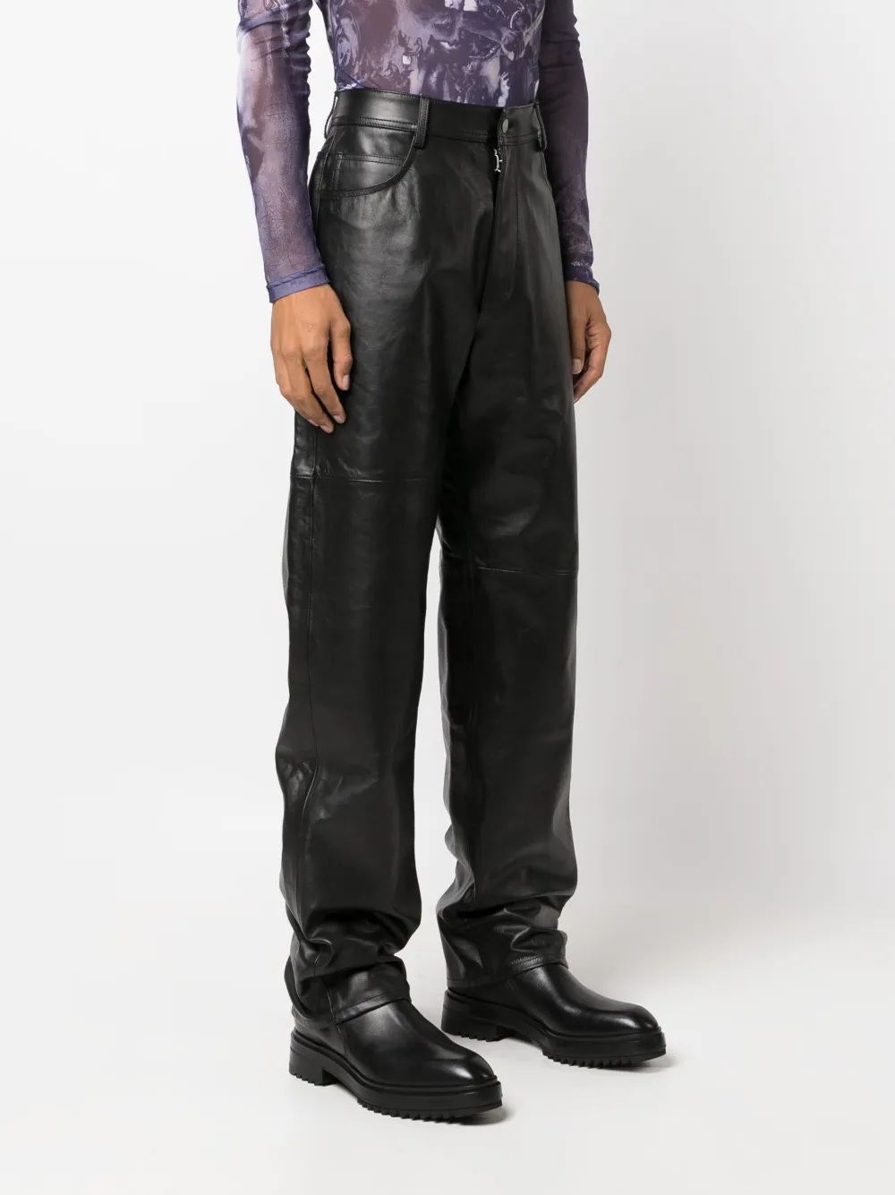 Noir, cuir de veau, coton, patch logo sur l’arrière, passants de ceinture, boutonnière sur le devant, fermeture zippée, taille mi-haute, coupe ample, cinq poches classiques, coupe longue.