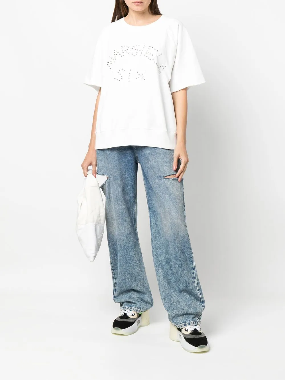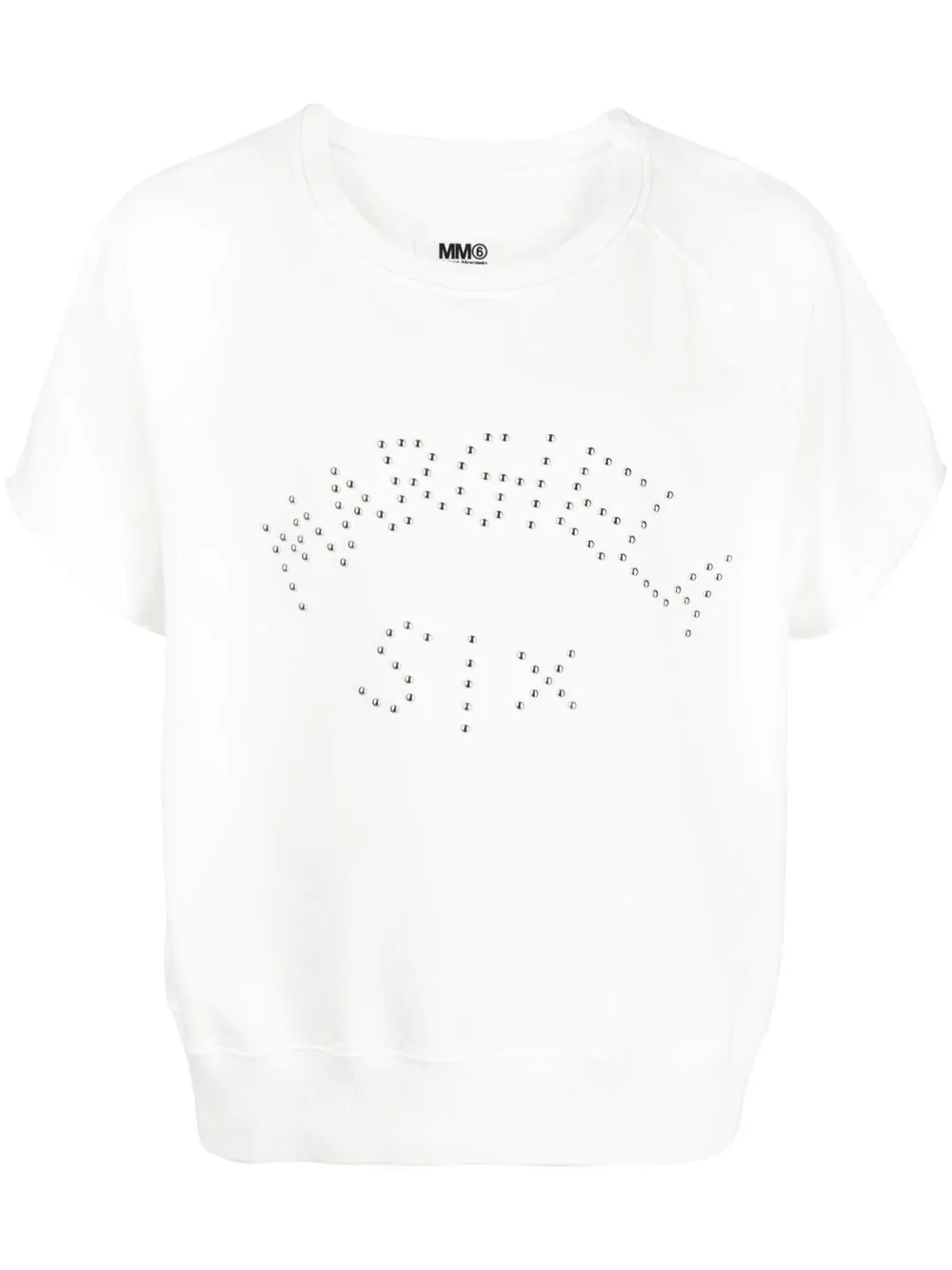Blanc Cloud, coton, tricot point jersey, bord effiloché, détails de clous argentés, appliqué logo, encolure ronde, manches courtes, ourlet droit.